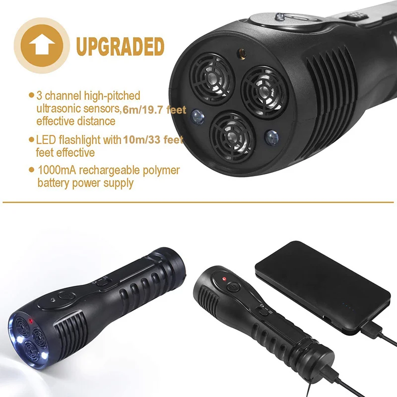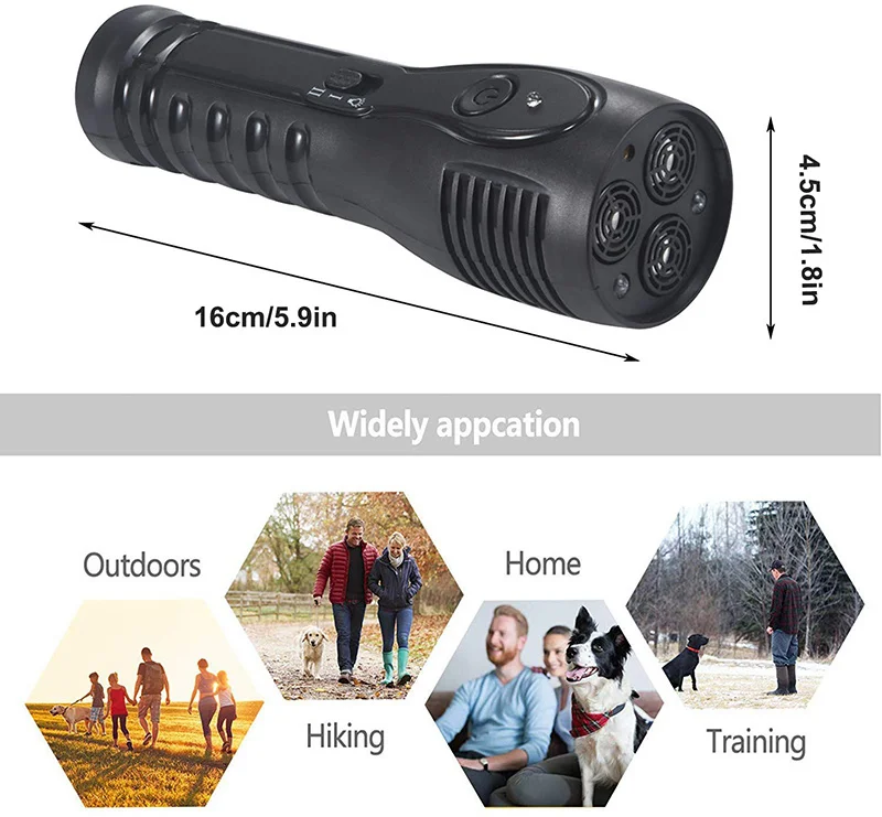 【Multifunción y portátil】-El repelente antiladridos de mano es pequeño en tamaño y tiene una linterna LED con 10M / 33 pies efectivos y la batería de polímero recargable de 1000mA, que no solo está disponible en el entrenamiento de perros, ¡pero también trabajo al aire libre, viajes, correr, patrulla de seguridad, etc!