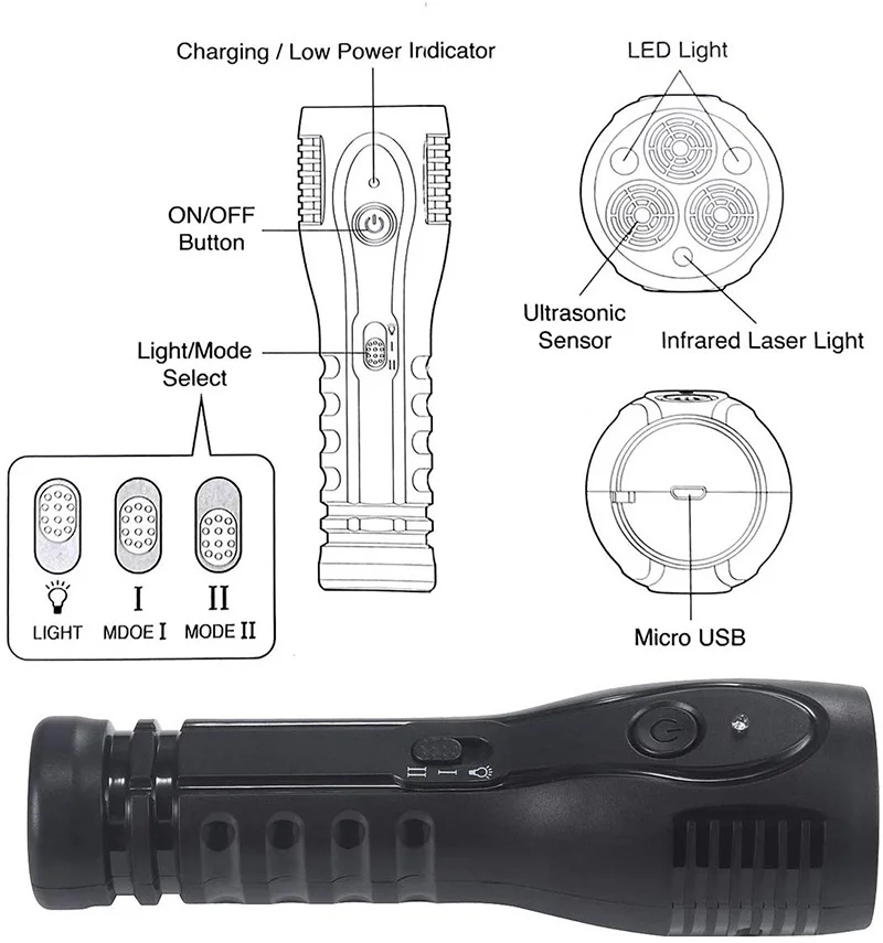 Carga/indicador de baja potencia/luz LED/sensor ultrasónico/luz láser infrarroja/micro USB