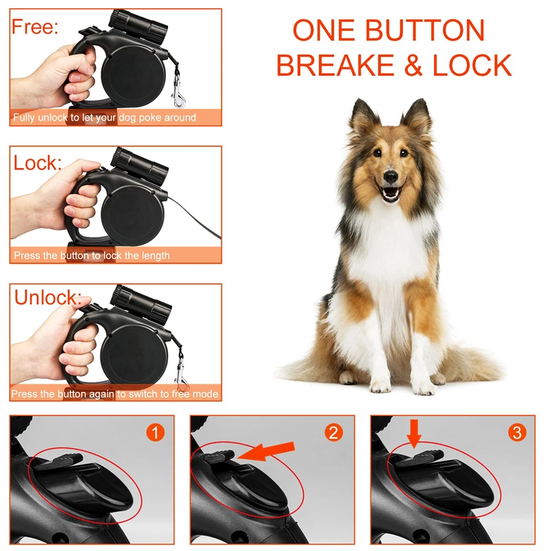 【UN BOTÓN DE FRENO Y BLOQUEO】Diseñado con botón de pausa y bloqueo de liberación rápida que permite que la correa del perro se ajuste a una longitud cómoda con facilidad, asegurando que usted tiene un control completo sobre la seguridad de su perro. Benepaw