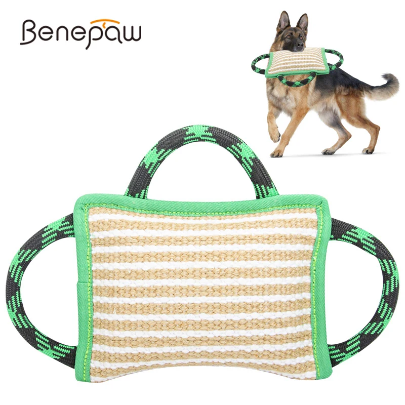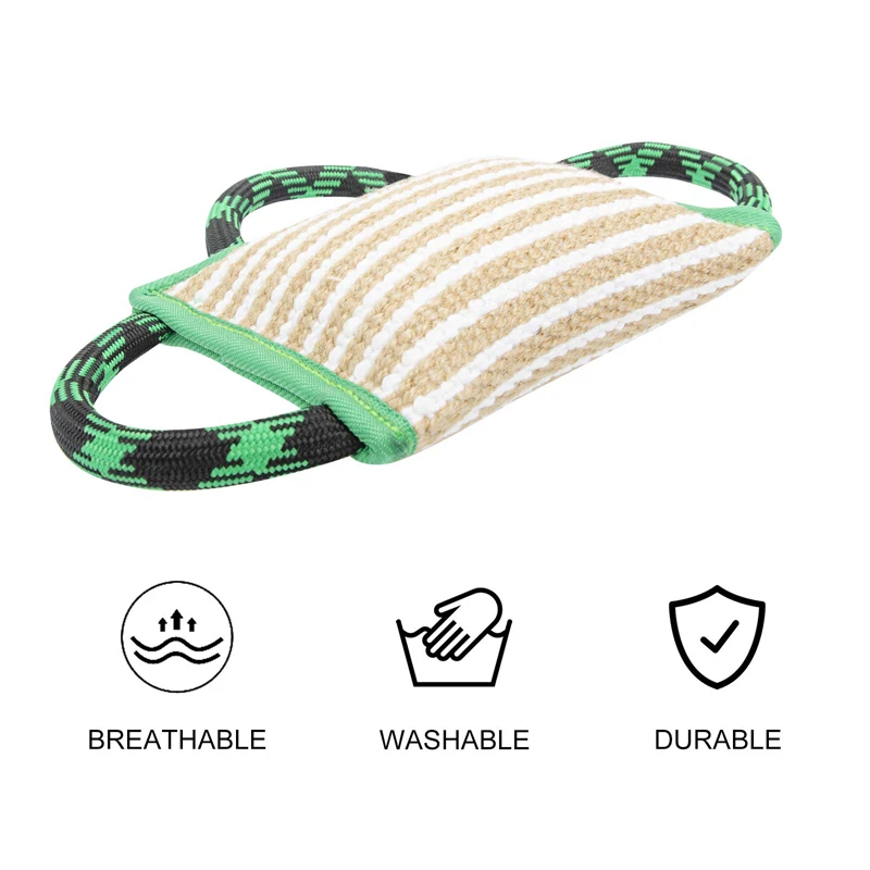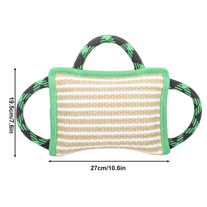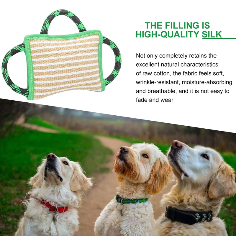 【Material duradero】Nuestra almohada de entrenamiento para perros con costuras dobles, tres asas de nailon y una superficie resistente de manga para morder está hecha de yute. Perfecto para el juego interactivo y la conducción.