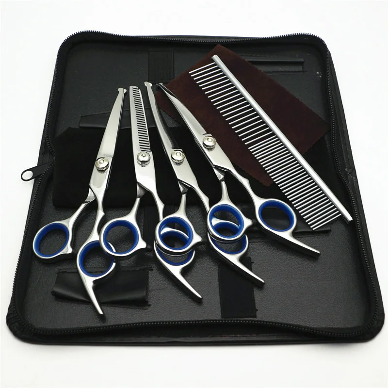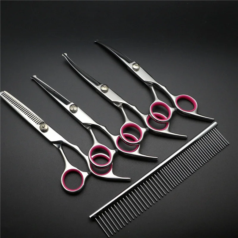 EL JUEGO DE 4 incluye:. Tijera recta de punta redonda de 17cm/6,7 pulgadas X 1, 17cm/6,7 pulgadas Tijera de adelgazamiento X1, 17cm/6,7 pulgadasPunta de tijera curva hacia abajo X1, 17cm/6,7 pulgadas Punta de tijera curvada hacia arriba X1,Perro libre peine X1 (16,5x2,9 cm/6,5x1,1 pulgadas)
