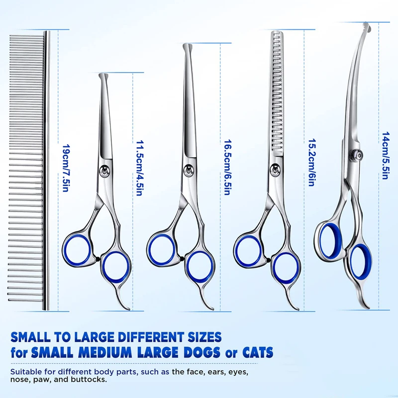 【 Juego de tijeras para el cuidado de perros 6 en 1 】El juego de tijeras de aseo para perros viene con 2 tijeras rectas, 1 tijera de adelgazamiento, 1 tijera curva, 1 peine de aseo y 1 estuche de almacenamiento