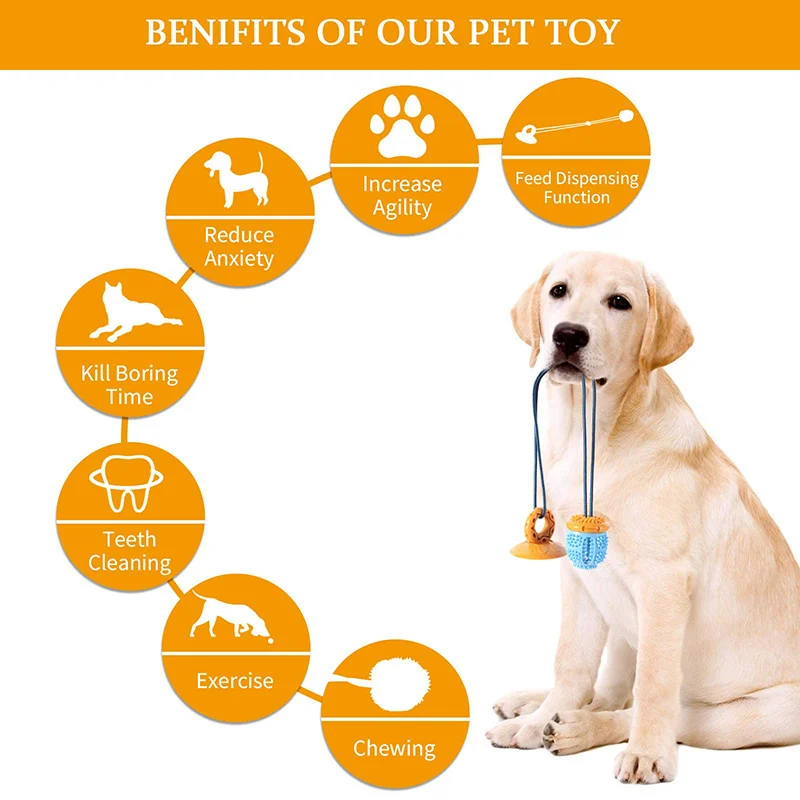 El juguete multifuncional es el mejor compañero de juegos para mascotas:Chupe el juguete en el suelo para que el perro pueda jugar cuando esté solo en casa. Es una buena manera de limpiar los dientes masticando la bola, también es un buen juguete dispensador de comida. Y puede jugar juegos interactivos con el perro en su tiempo libre. No importa el interior nuestro al aire libre. Sostenga el juego de cuerda con el perro o la base de succión separada, tire el juguete y deje que el perro lo atrape.