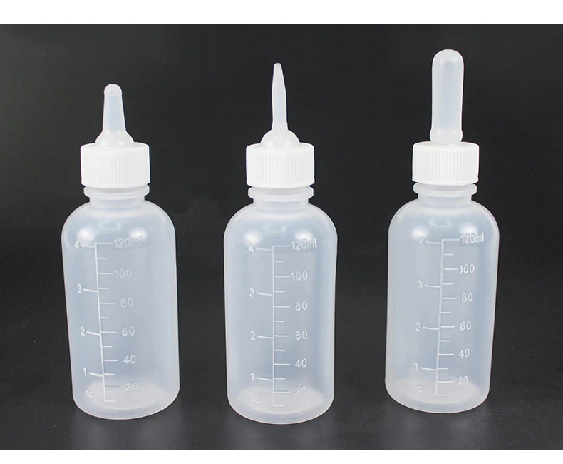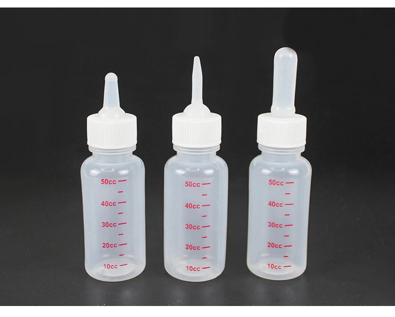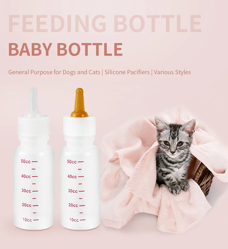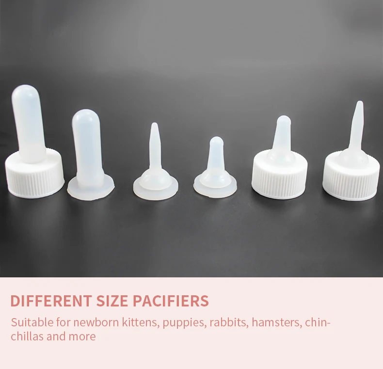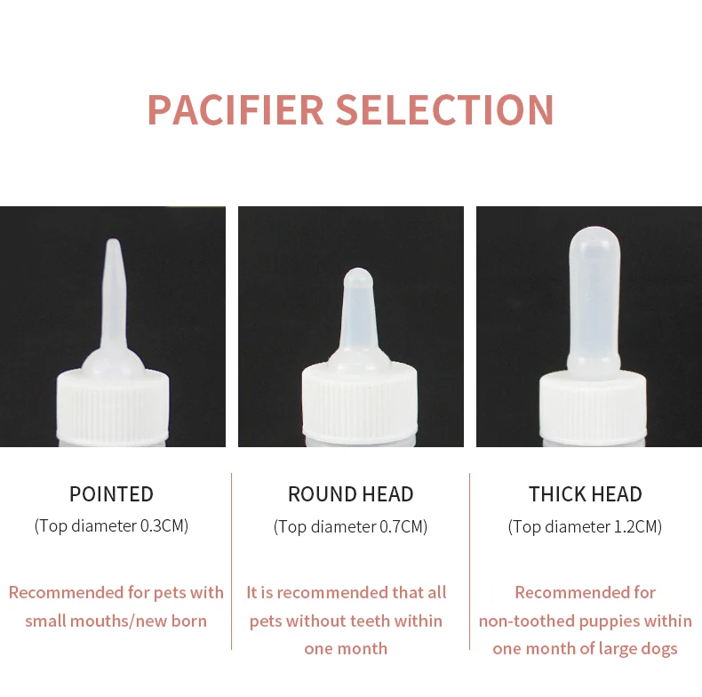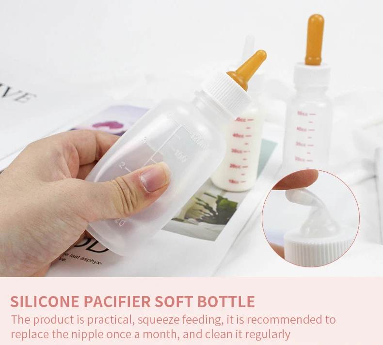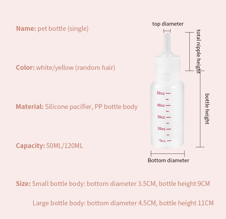 Descripción: Nombre del producto: botella de leche para mascotas (individual) Color: blanco, amarillo (cabello aleatorio) Material: chupete de silicona, botella de PP Capacidad: 50ML/120ML Tamaño del chupete: Pezón puntiagudo: el diámetro de la parte superior es de 0,3 cm, la altura total del pezón es de 5cm Pezón redondo: el diámetro superior es de 0,7 cm, la altura total del pezón es de 4cm Pezón grueso: diámetro superior: 1,2 cm, la altura total del pezón es de 5,5 cm