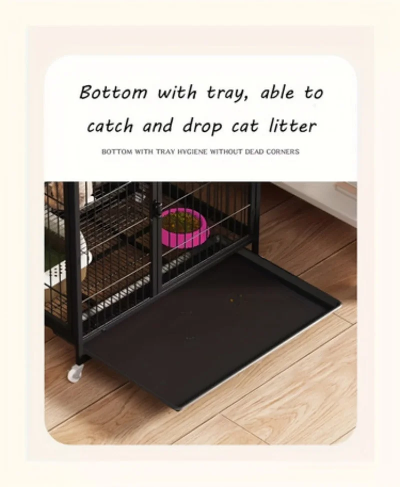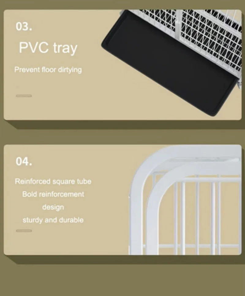 Fácil de limpiar: Nuestra jaula para gatos se puede limpiar rápidamente, solo necesita sacar fácilmente la bandeja, quitar la arena u otros desechos y volver a colocarla. Esto hace que sea muy conveniente mantener la jaula del gato limpia, ayudando a reducir el olor y mantener la higiene.