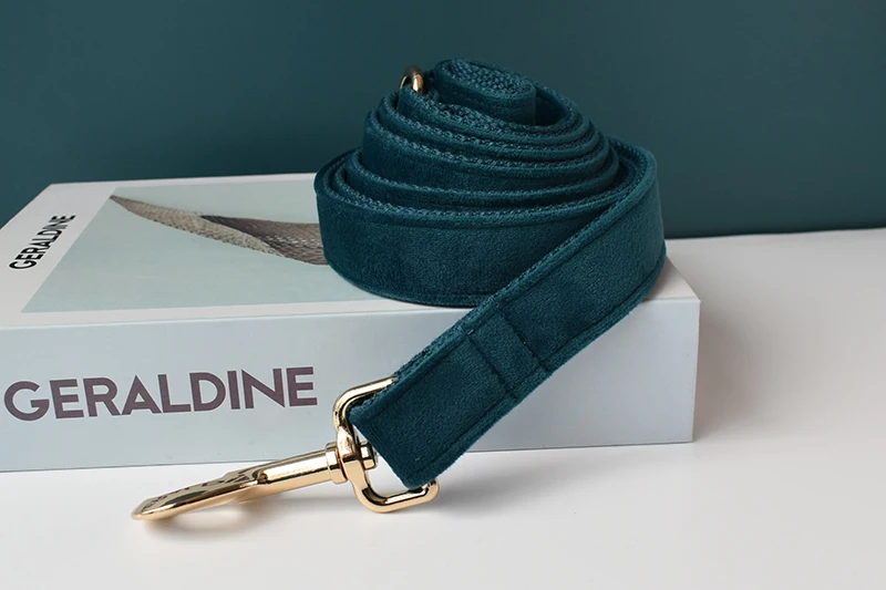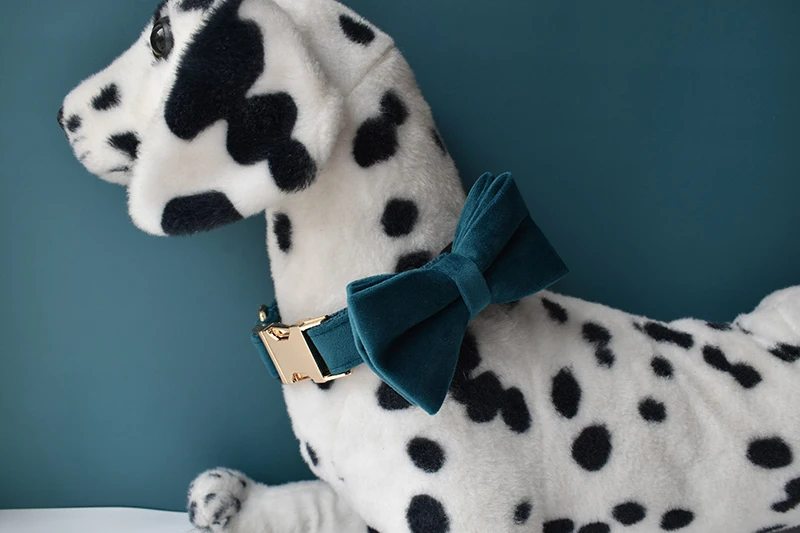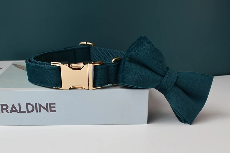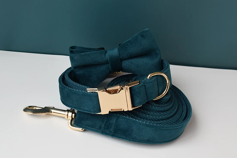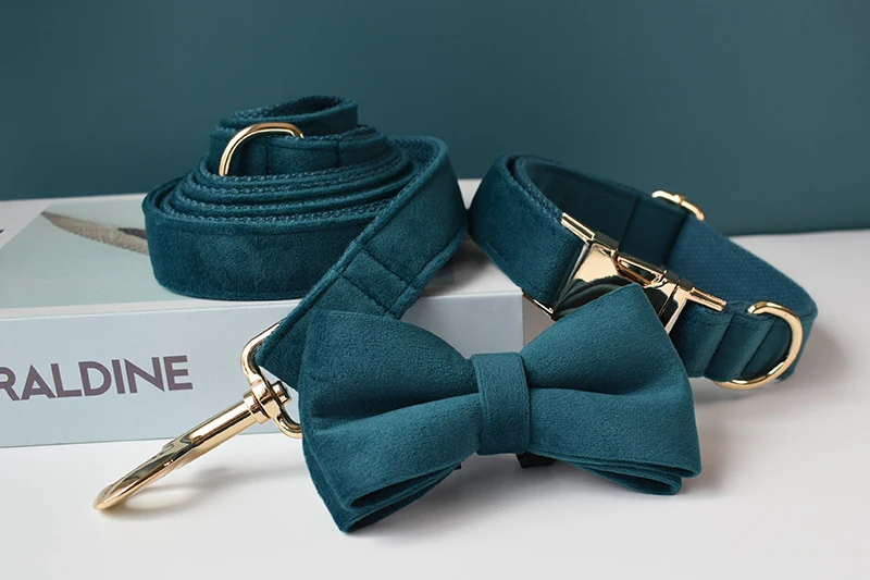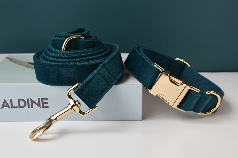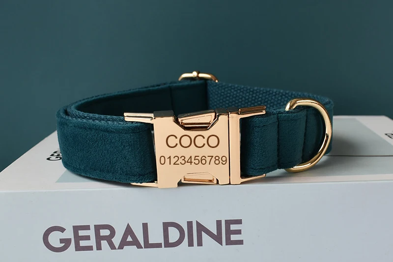 Collar azul pavo real, tela de calidad de terciopelo personalizada para perros pequeños, medianos y grandes, piezas de Metal personalizadas, accesorio para mascotas, franela lette30