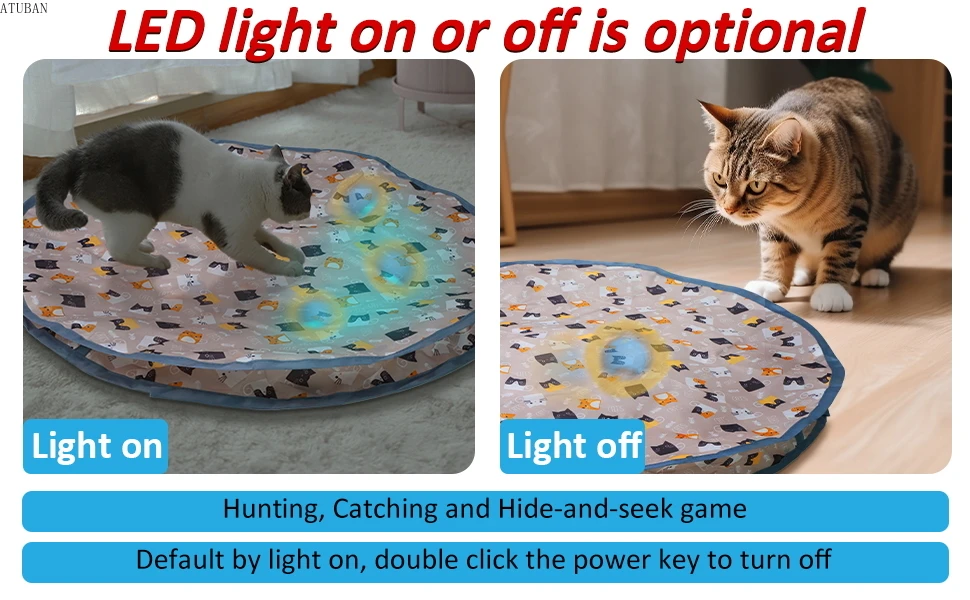 Encendido/apagado automático y activación por movimiento: El encendido de los juguetes automáticos para gatos funciona 5 minutos y luego ingresa al estado de reposo, se reactivará con una palmadita. Si no hay contacto durante el tiempo de espera, se reactivará automáticamente durante 60 segundos cada 1 hora para atraer la atención de los gatos.