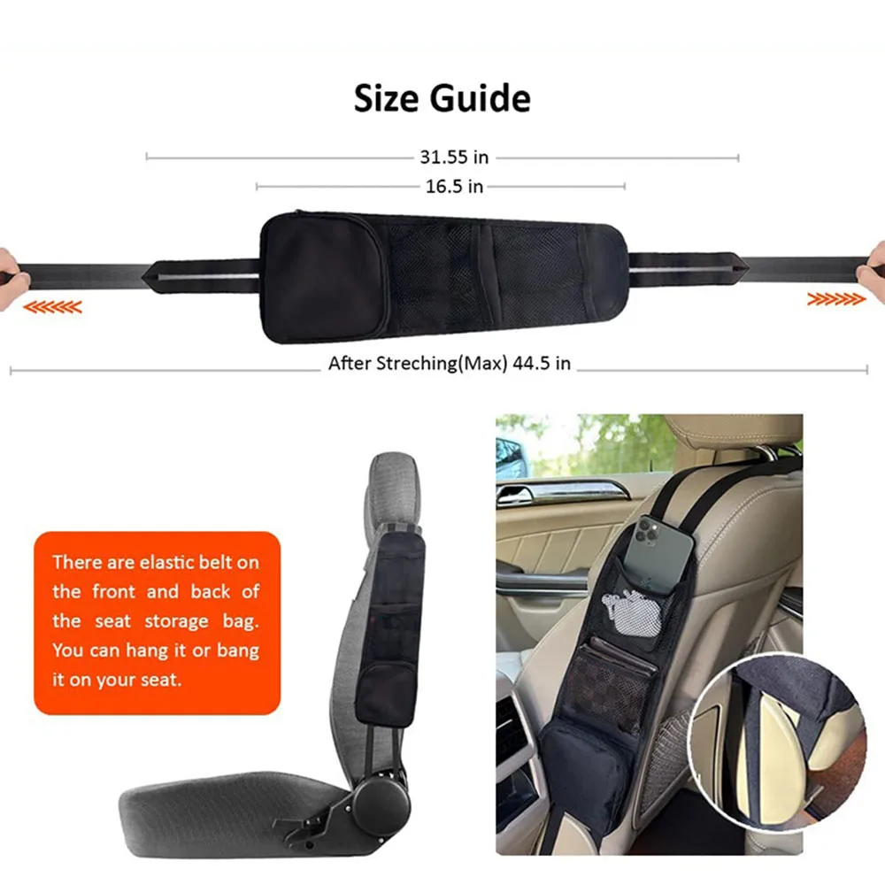 Cuerda elástica + cinturón de fijación de alta elasticidad: la parte superior está diseñada con una cuerda elástica, combinada con un cinturón de fijación de alta elasticidad, que se puede ajustar fácilmente según el tamaño del asiento de los diferentes modelos, asegurando que la bolsa de almacenamiento esté firmemente colgada en el respaldo de la silla, no ocupa demasiado espacio y evita sacudidas o resbalones durante la conducción.