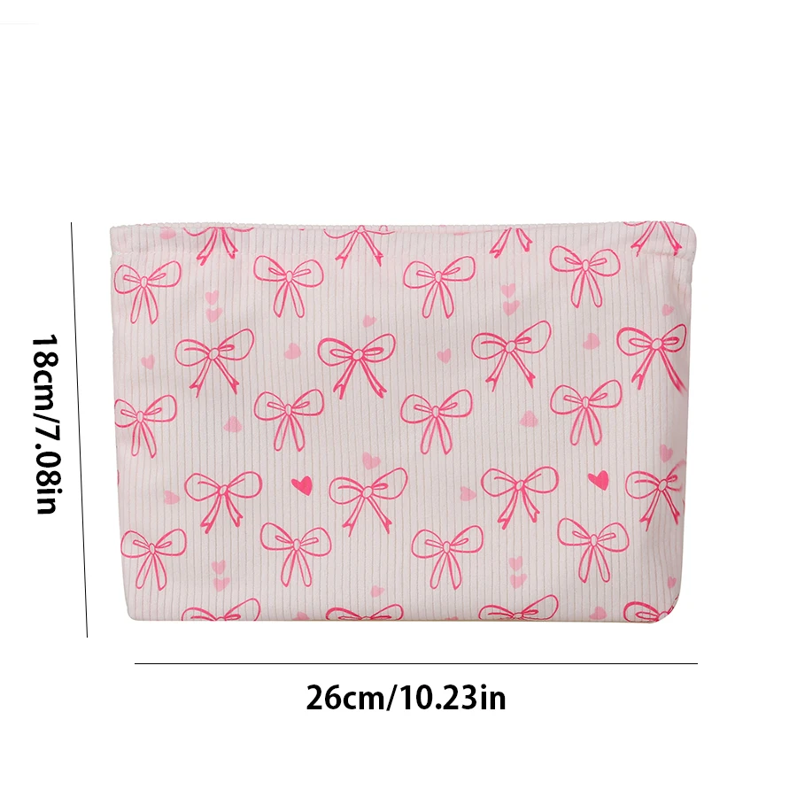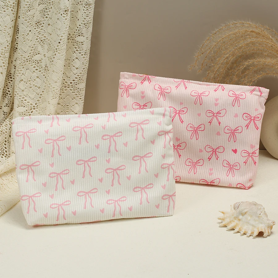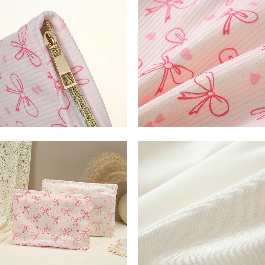 Bolsa de cosméticos con diseño de cereza y lazo, organizador de maquillaje con cremallera de pana, bolsa de almacenamiento de cosméticos dulce de viaje ligera para mujer