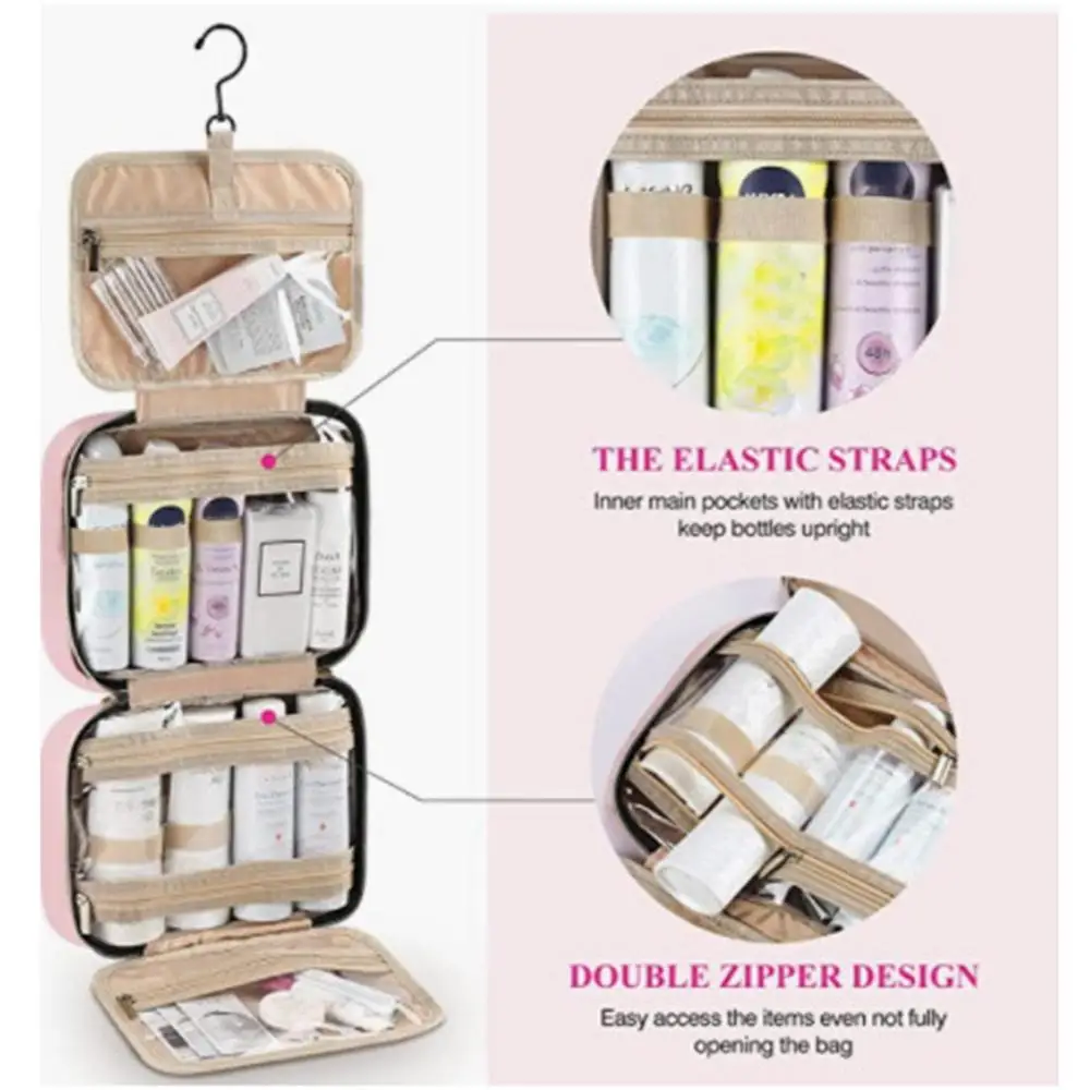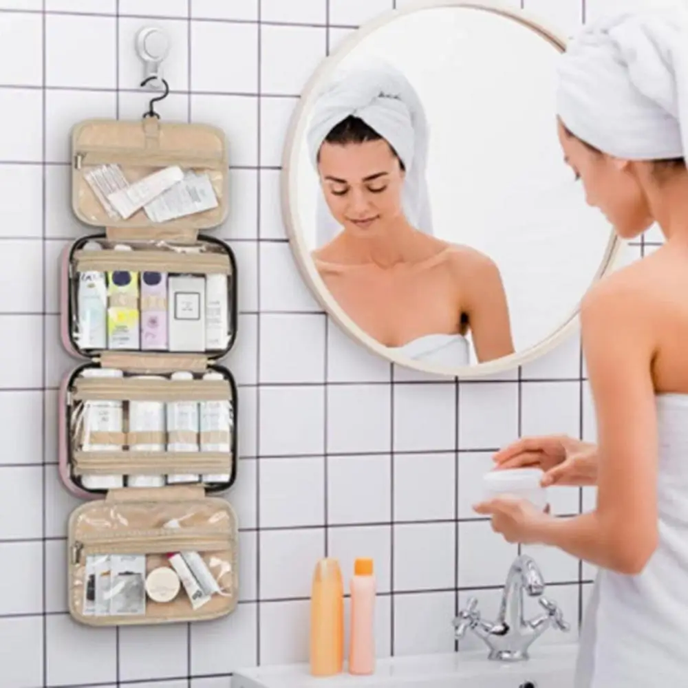 4.| Solución inteligente: no más rebuscar en su bolsa de cosméticos de viaje para encontrar lo que necesita. Simplemente cuélguelo detrás de la puerta o en la pared con el gancho en la capa interior y vea y acceda fácilmente a los artículos que necesita.