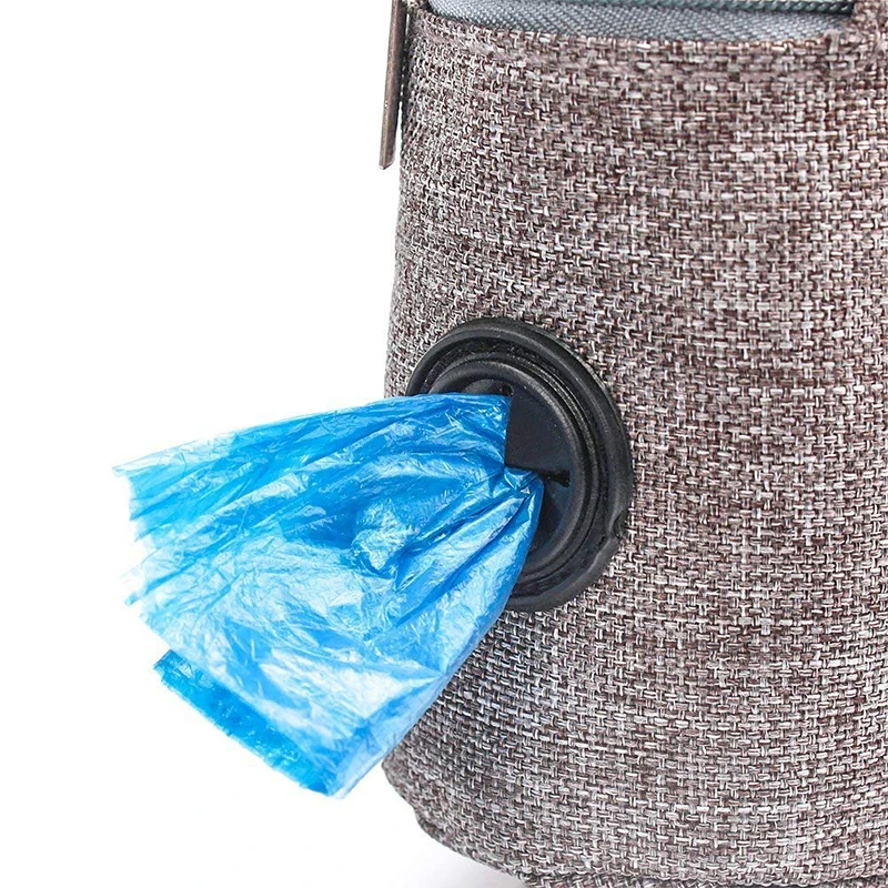3. El lado del dispensador de estuche de transporte integrado es un bolsillo con cremallera y un tapón de goma para ayudarle a quitar las bolsas frescas del interior del rollo. El compartimento principal con cordón se utiliza para aperitivos y es de un tamaño perfecto para facilitar el acceso.