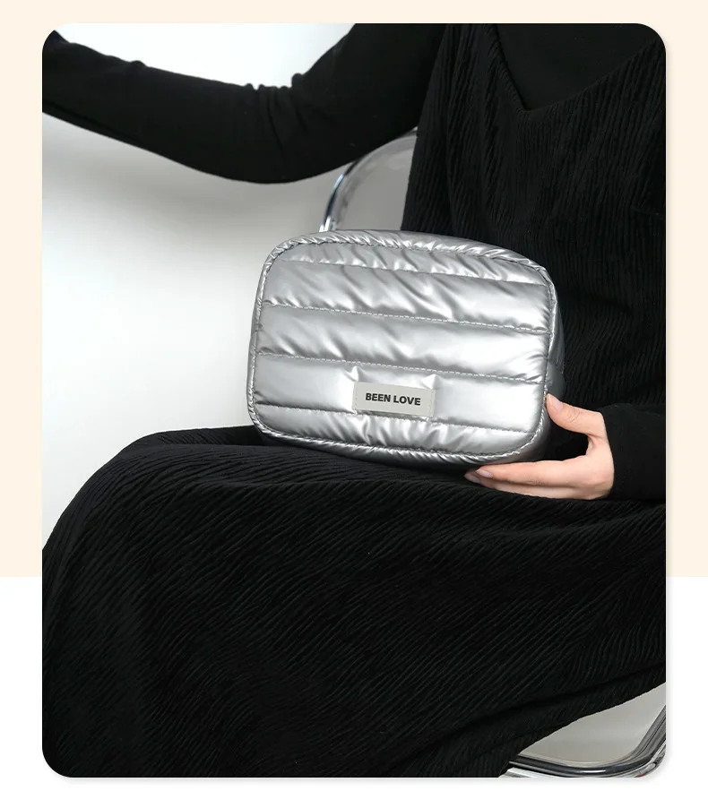 El color es plateado con un tacto brillante. Tiene el tamaño perfecto para llevar sin ser demasiado grande ni pequeño. Lo más importante es que tiene dos bolsillos en el forro, ideales para guardar pequeños objetos. La textura es suave y la cremallera se abre y cierra sin problemas. La calidad es realmente buena para el precio, lo cual me sorprendió. El exterior es suave y esponjoso, lo que lo hace agradable al tacto. Me gusta.