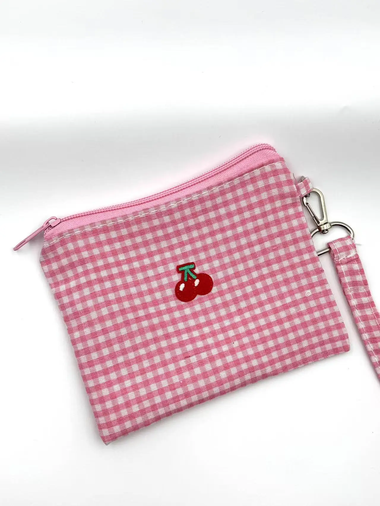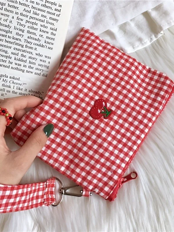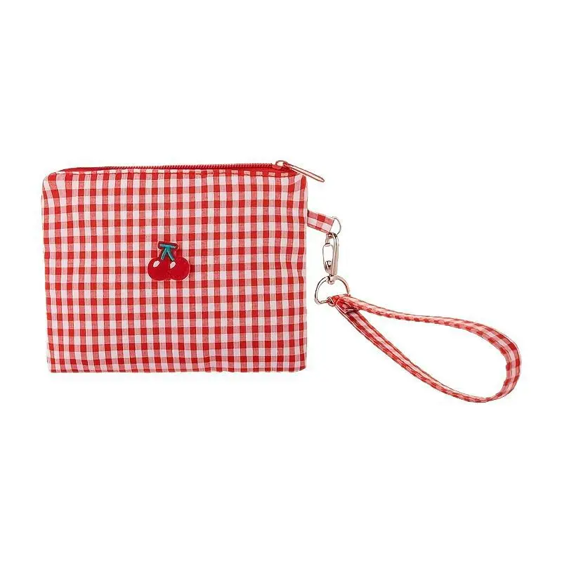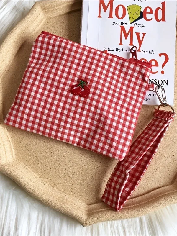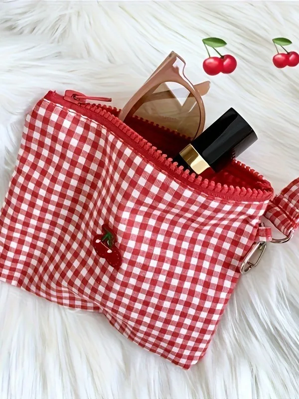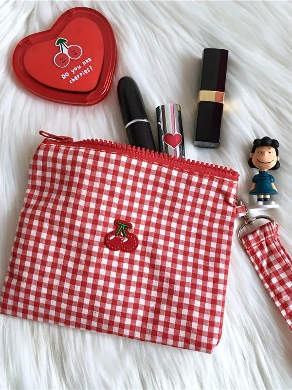 Bolsa de maquillaje de lona con estampado de cereza, bonito organizador de lápiz labial con cierre de cremallera, bolsa cosmética portátil ligera para mujeres y niñas