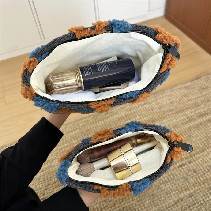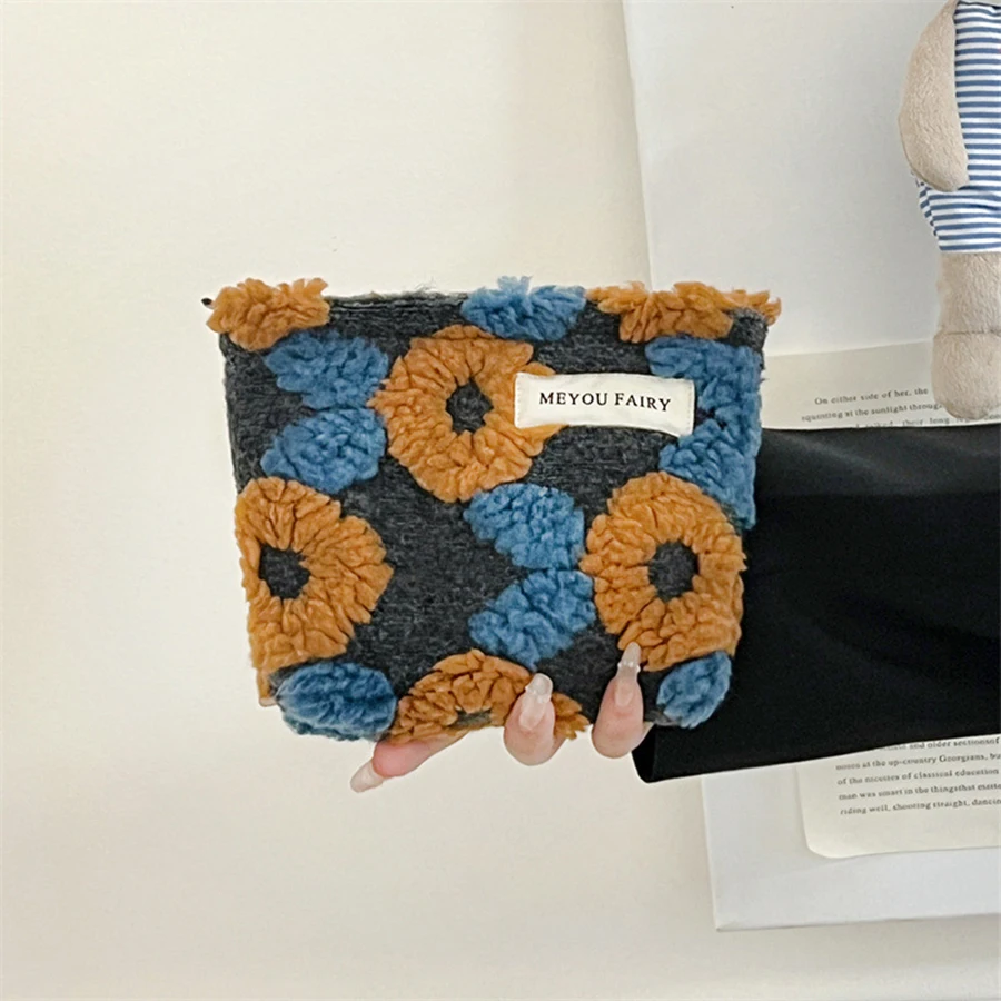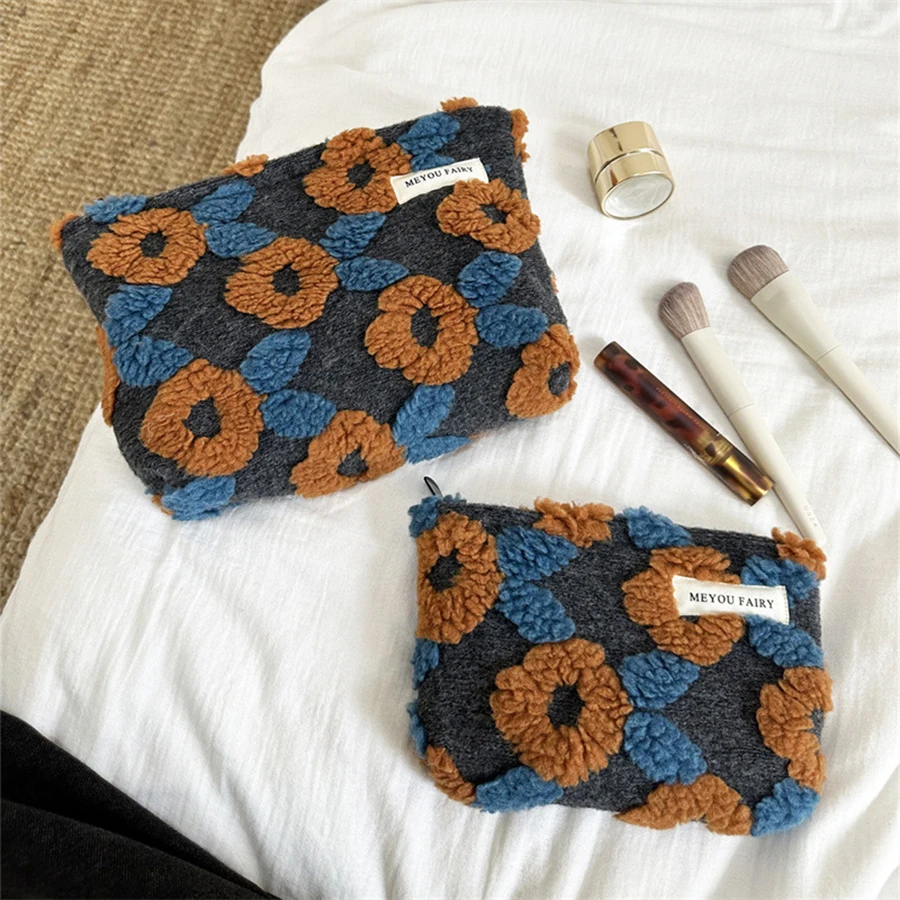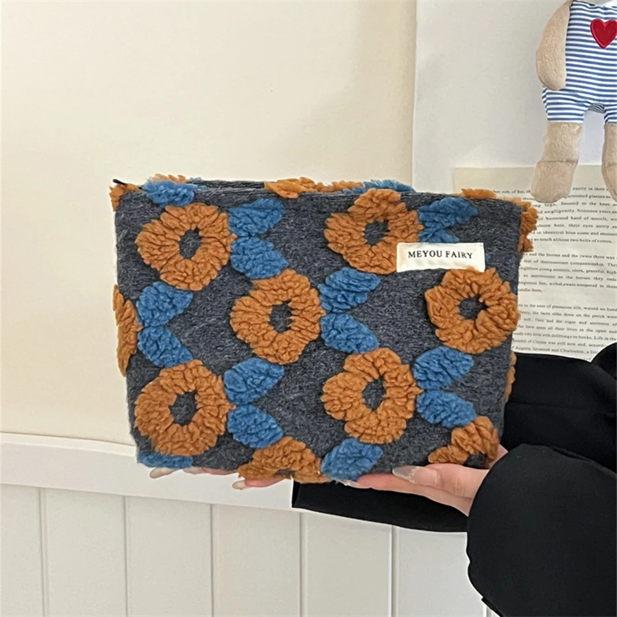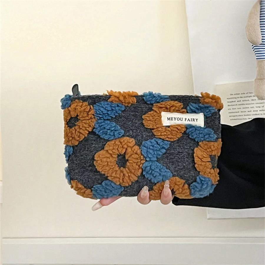 Bolsa de maquillaje portátil de felpa con cremallera, bonita bolsa de maquillaje Floral Kawaii, bolsa de cosméticos de moda para bolso, estuche para lápices