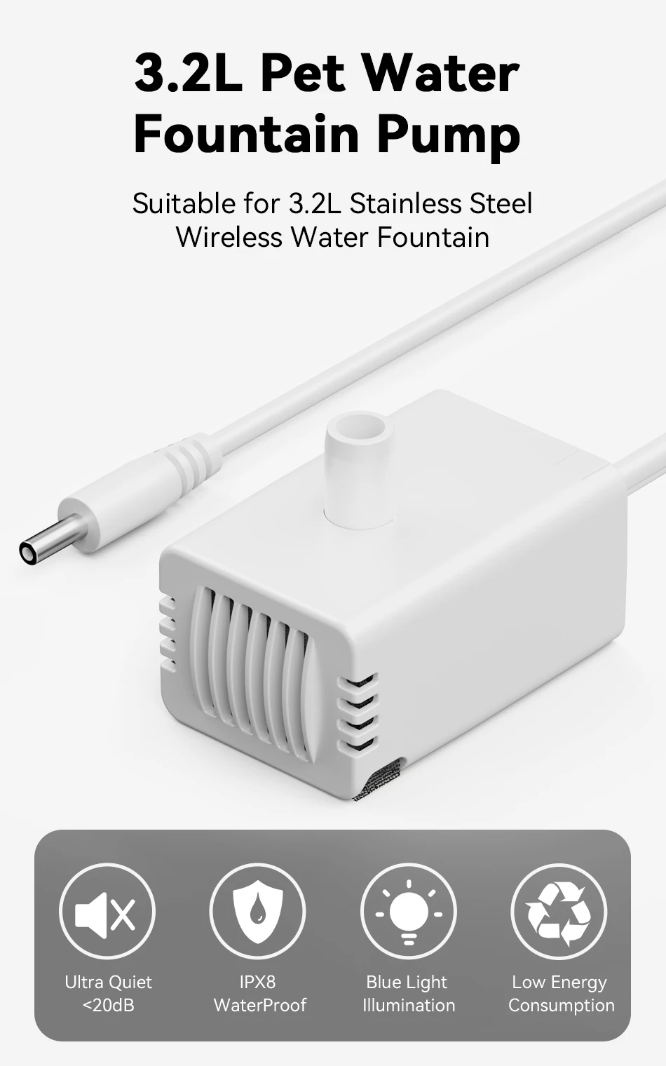 Bomba de agua ROJECO para fuente de agua inalámbrica de acero inoxidable de 3,2 L para gatos, fuente para beber para mascotas, bomba de agua para reemplazo de bebedero para gatos