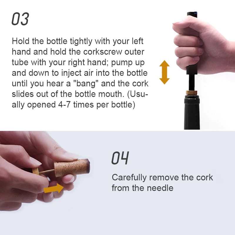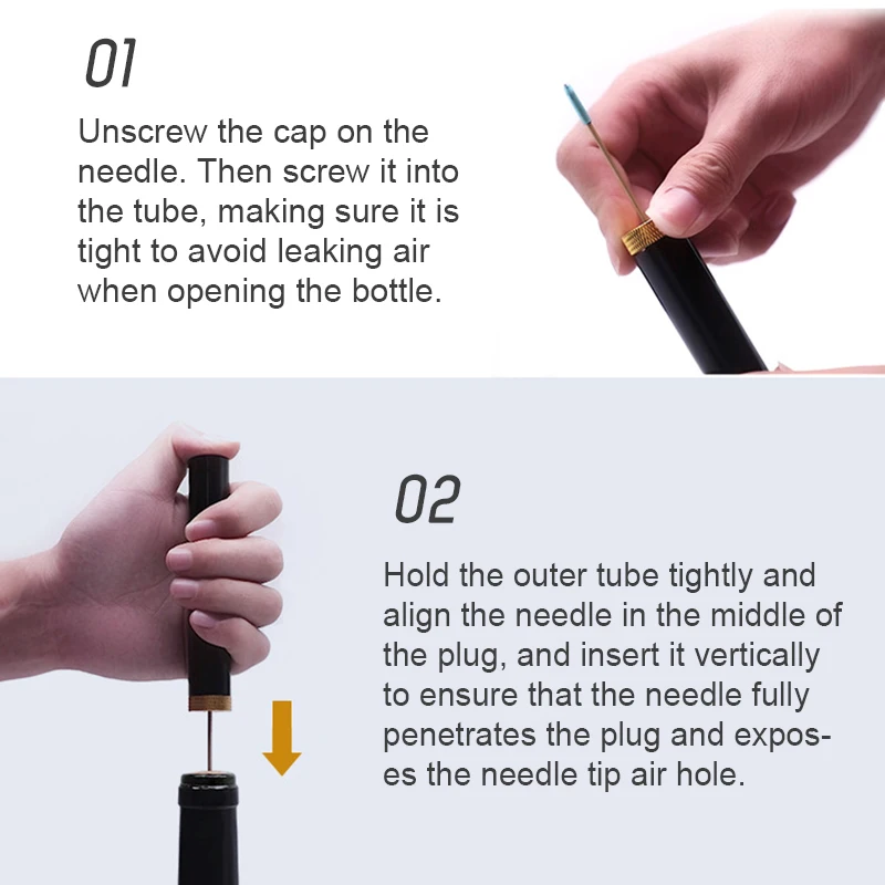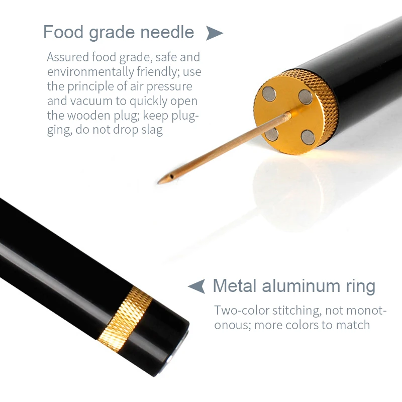 2. [Retire limpiamente cualquier corcho]: en comparación con el corcho tradicional, el sacacorchos de bomba neumática de vino puede quitar limpiamente el corcho natural y evitar que el corcho contamine el vino. El Sacacorchos de vino utiliza una aguja de metal afilada que se puede deslizar cuidadosamente en el centro del corcho para un desmontaje completo.