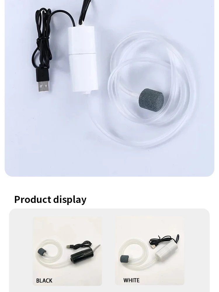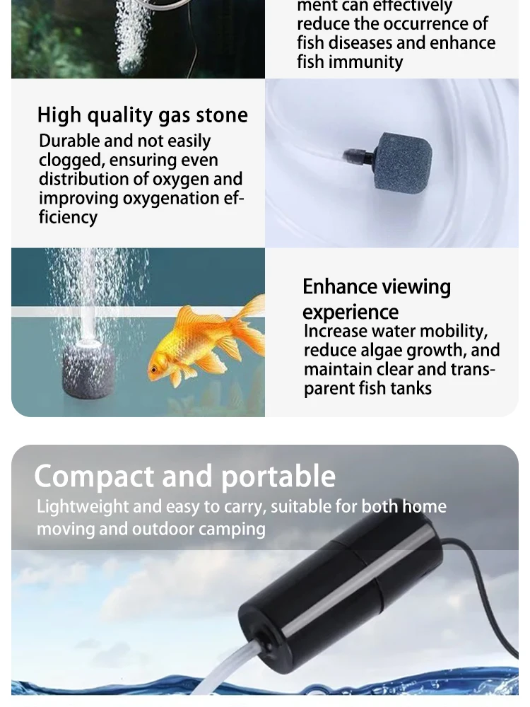 • Bomba de oxígeno para pecera pequeña:Diseñado específicamente para peceras pequeñas, este oxigenador proporciona una oxigenación eficiente.
