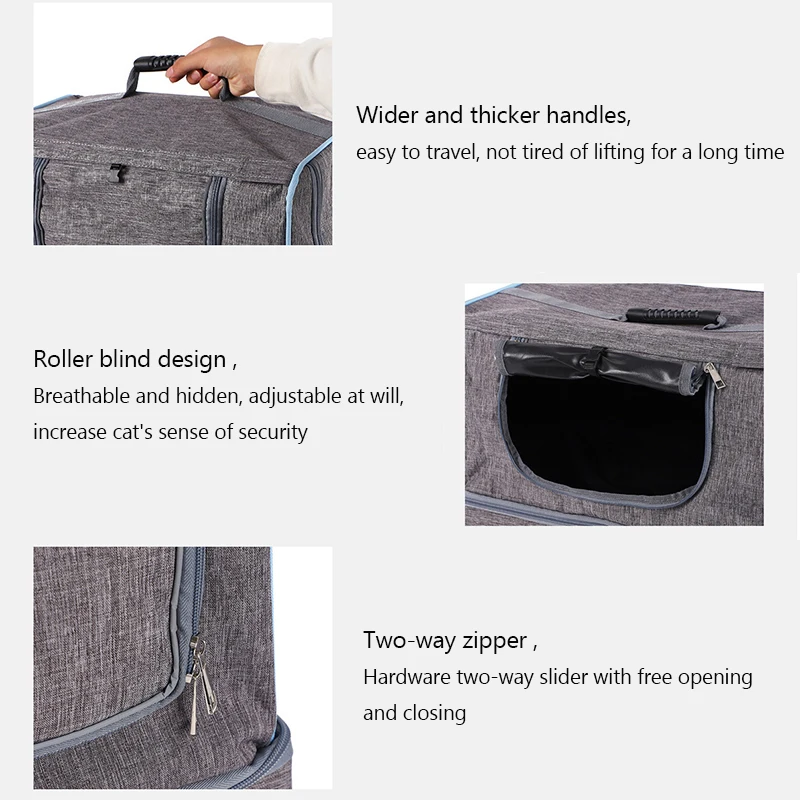 2.Cuidadoso detallado: asas más anchas y gruesas, fáciles de viajar durante mucho tiempo sin cansarse; El diseño enrollable se puede ajustar para ser transpirable y oculto, aumentando la sensación de seguridad para los gatos; Cremallera bidireccional, material de hardware, interruptor conveniente.