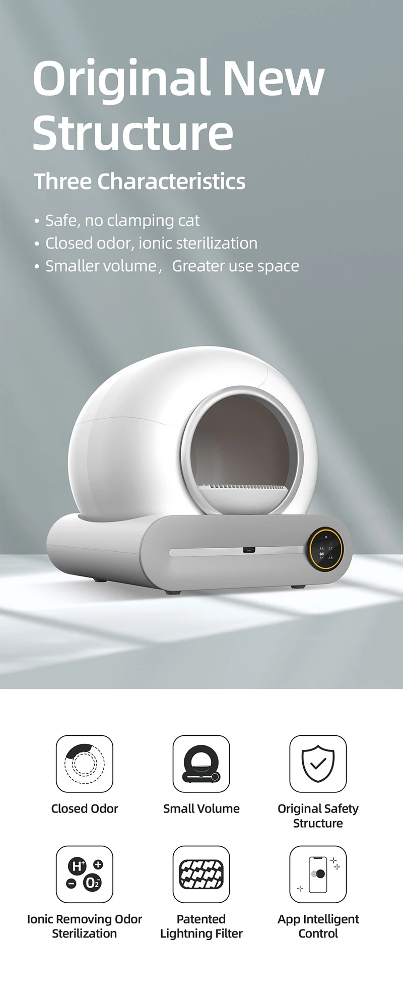 Innovadora tecnología de desodorización La caja de arena para gatos de autolimpieza adopta un innovador desodorante iónico electrónico, que es seguro y no tóxico, sin necesidad de reemplazar ningún consumible.El desodorante iónico comenzará a funcionar después de que su gato haya terminado de hacer caca, reduciendo las emisiones de olores en la habitación.