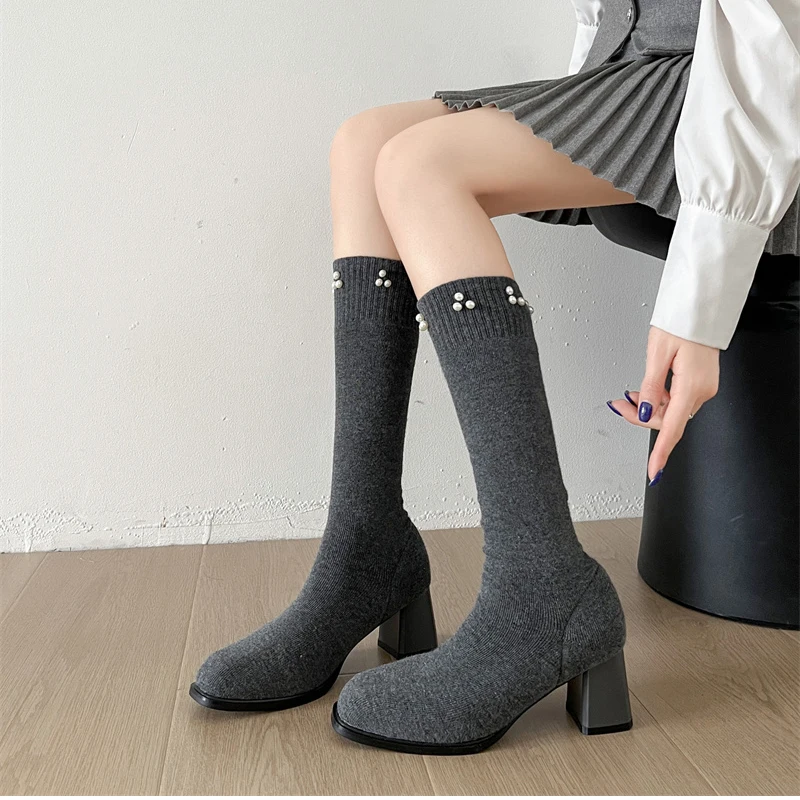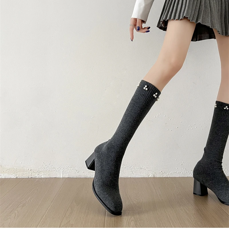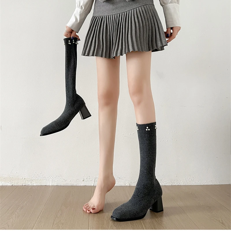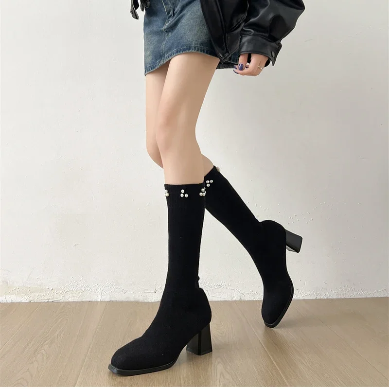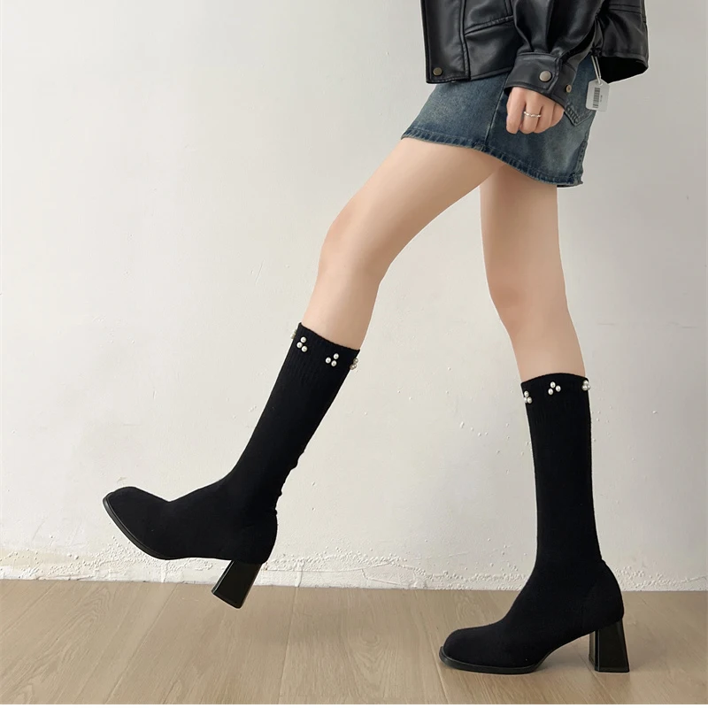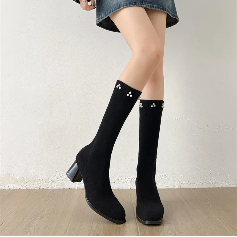 Botas altas hasta el muslo para mujer, botines largos de calcetín ajustado de tela elástica con perlas para otoño e invierno