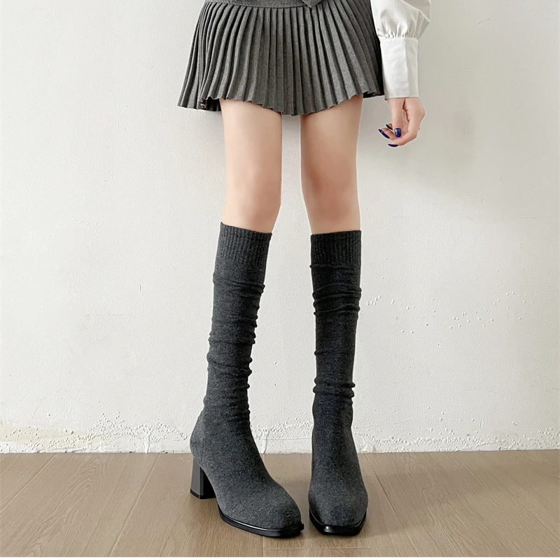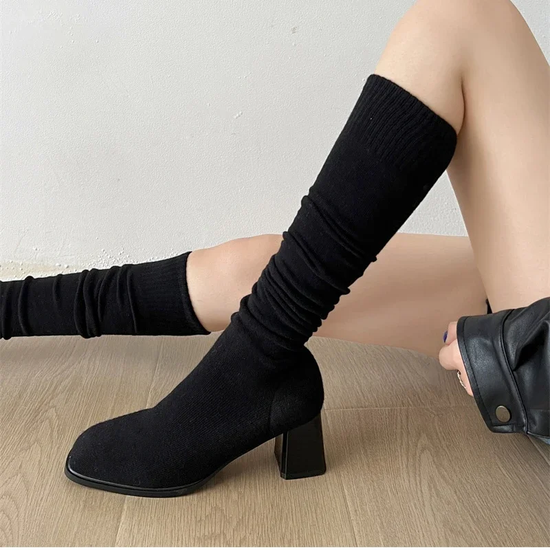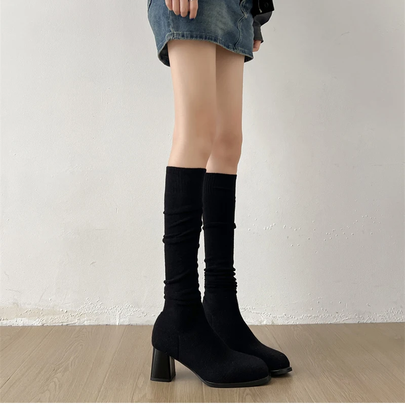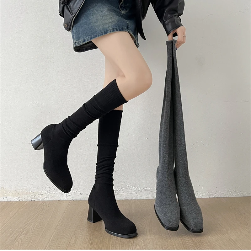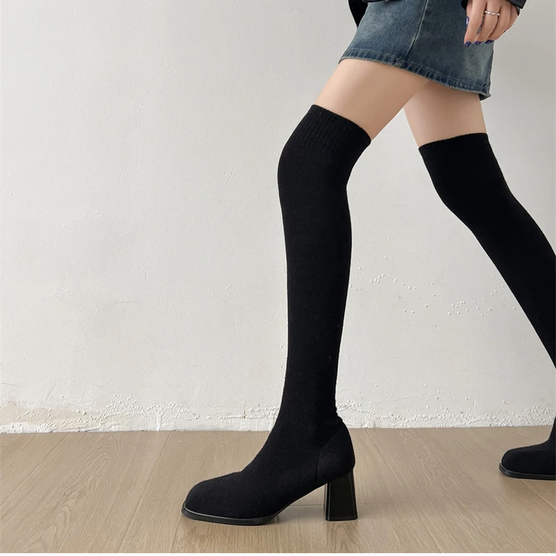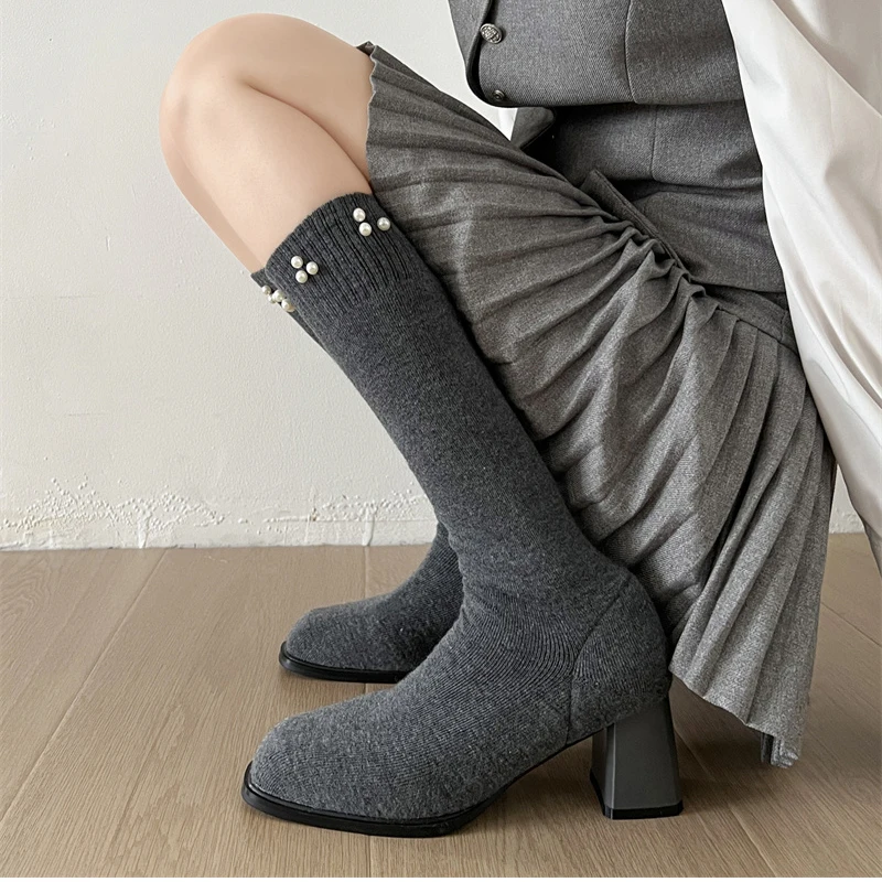 Botas altas hasta el muslo para mujer, botines largos de calcetín ajustado de tela elástica con perlas para otoño e invierno