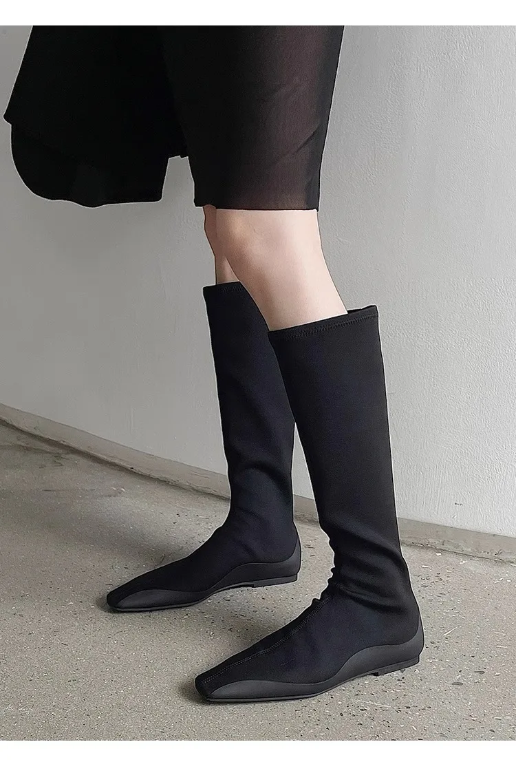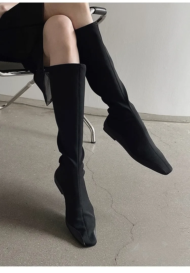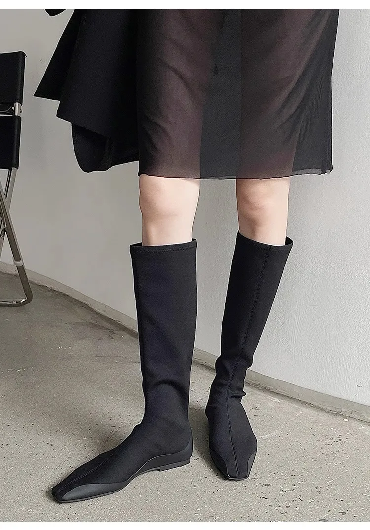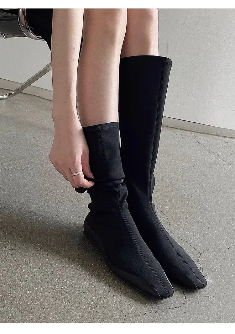 Botas de calcetín hasta la rodilla con parte inferior plana para mujer, botines largos de tela elástica con punta estrecha, botas de trabajo de estilo británico para Otoño e Invierno