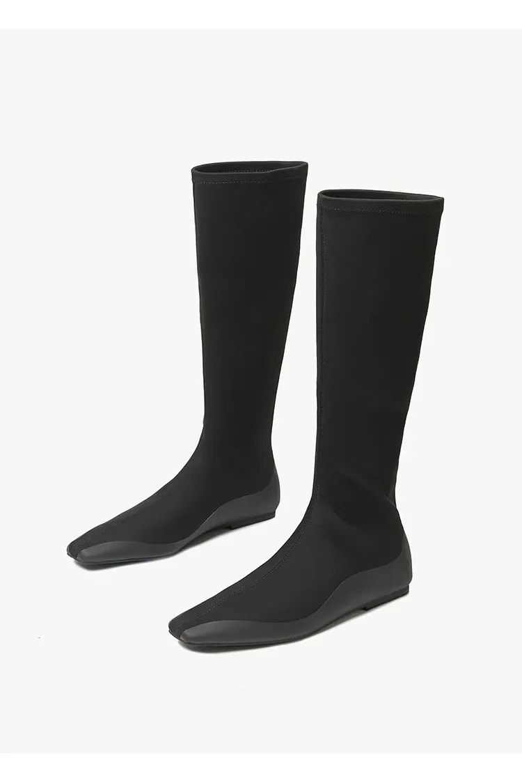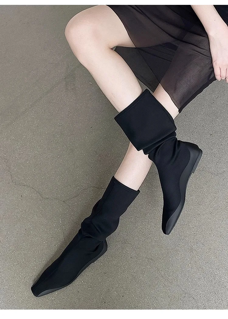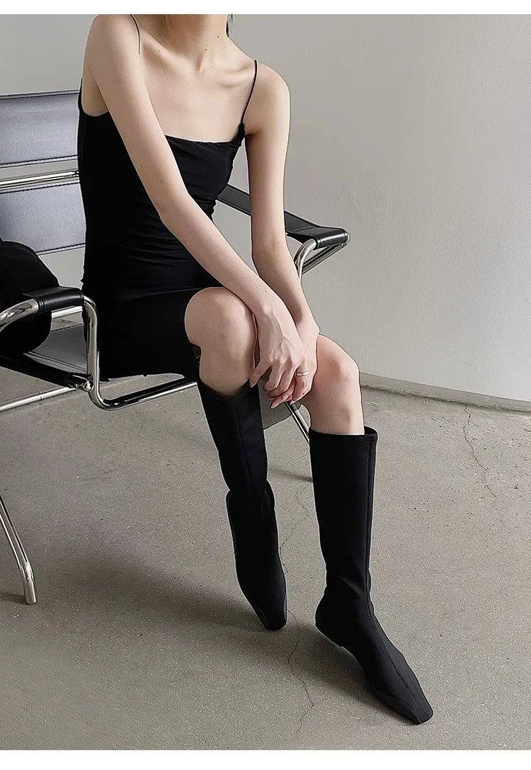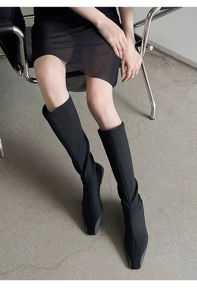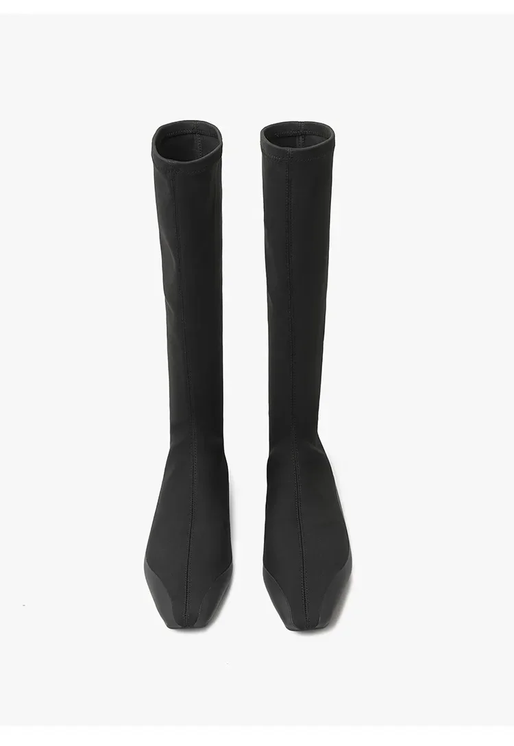 Botas de calcetín hasta la rodilla con parte inferior plana para mujer, botines largos de tela elástica con punta estrecha, botas de trabajo de estilo británico para Otoño e Invierno