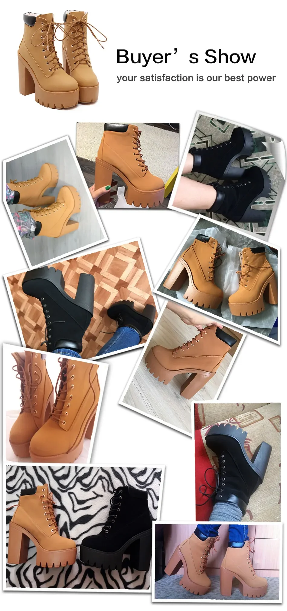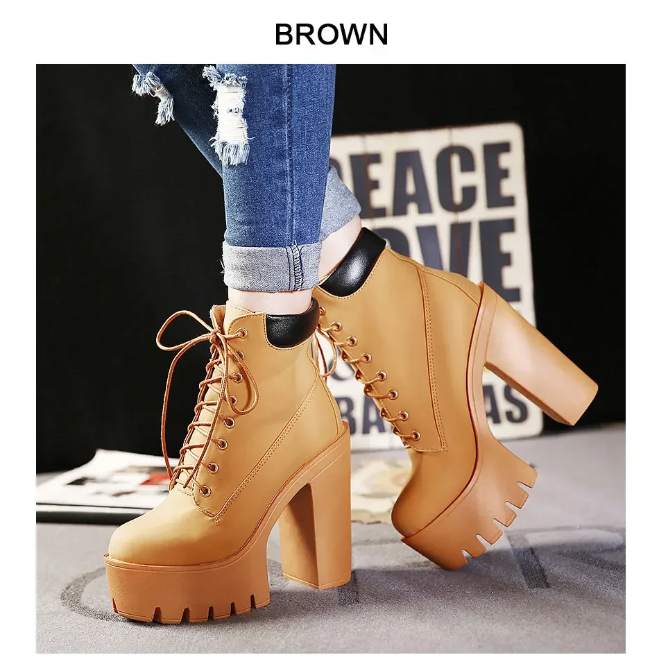 Botas cortas de tacón grueso para mujer, botines de punta redonda con cordones y tacón alto, Color sólido, impermeables, con plataforma, para motocicleta