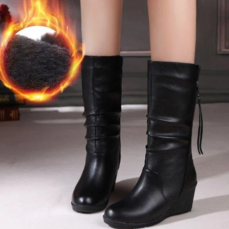 Botas de cuero con cuña y punta redonda Para mujer, zapatos de media caña con cremallera lateral, suela gruesa antideslizante, tacones altos