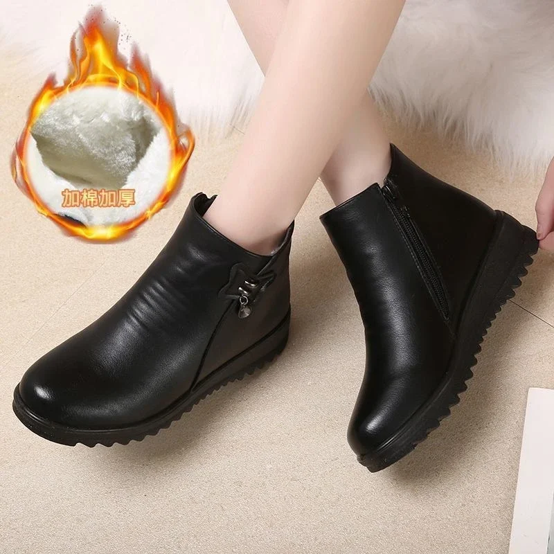 Botas de cuero informales para mujer, zapatos de media edad, cálidos, de algodón, antideslizantes, de lana, invierno, 2024