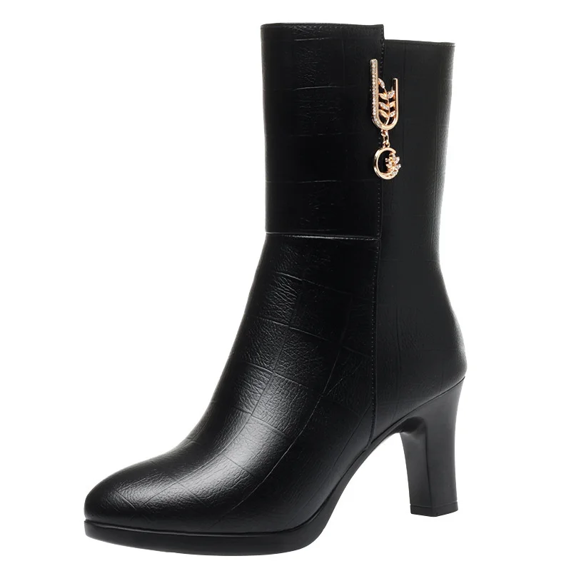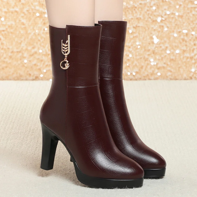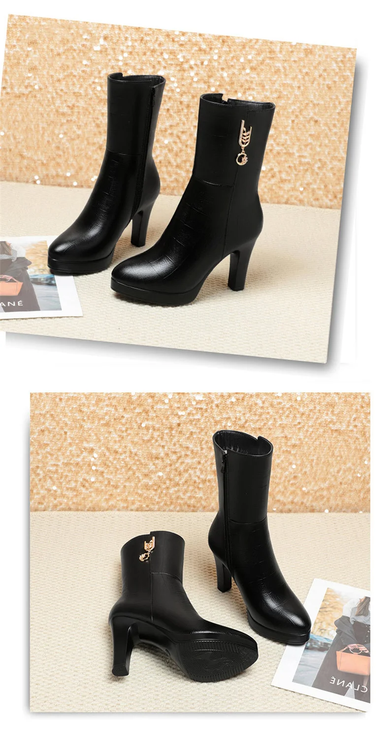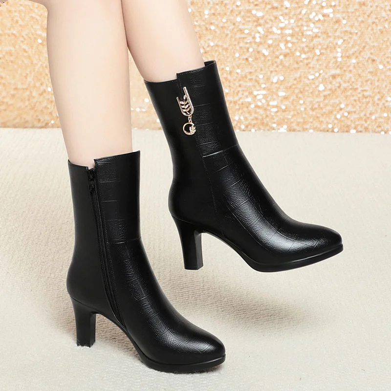 Botas de cuero de moda Otoño Invierno para mujer, botas cálidas de tacón alto de felpa, tendencia a media pantorrilla con cremallera, cabeza redonda, botas de algodón para madre al aire libre