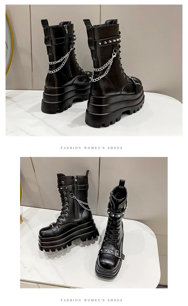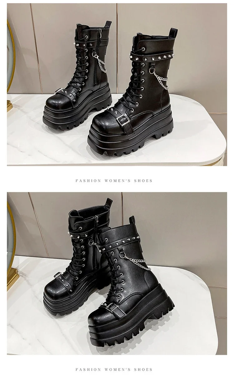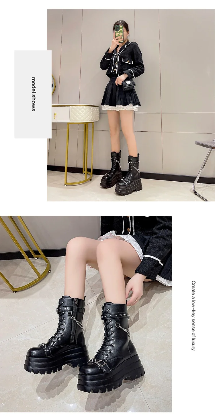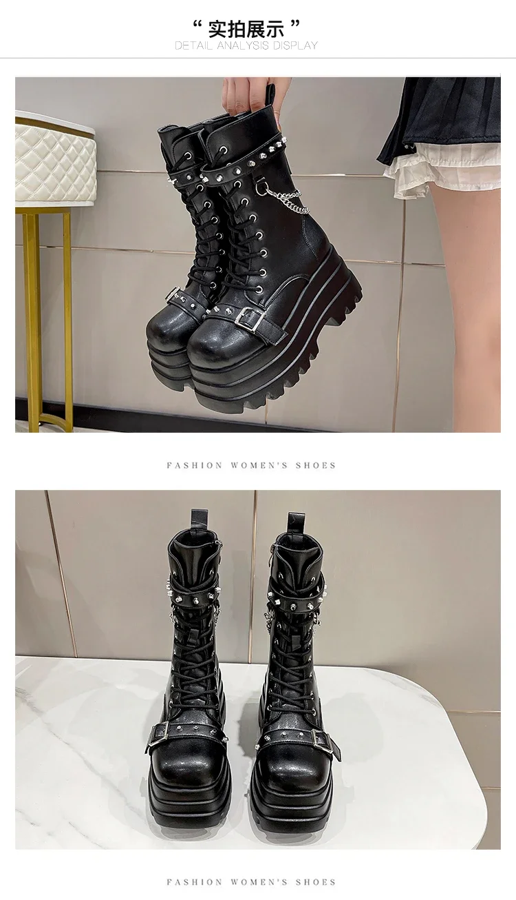 Botas góticas gruesas con plataforma para mujer, zapatos de otoño con hebilla, cuñas hasta la rodilla, Botas Punk Street Cosplay, cadena de motocicleta