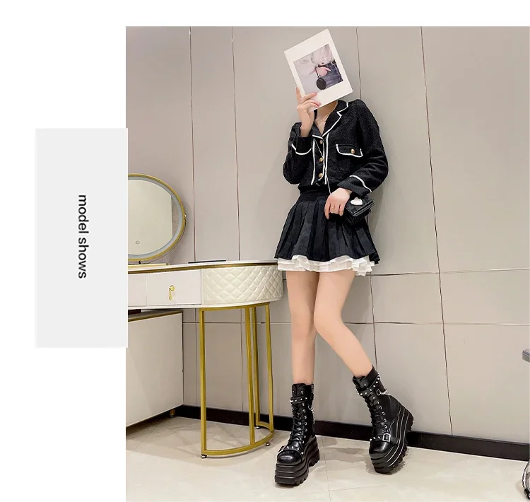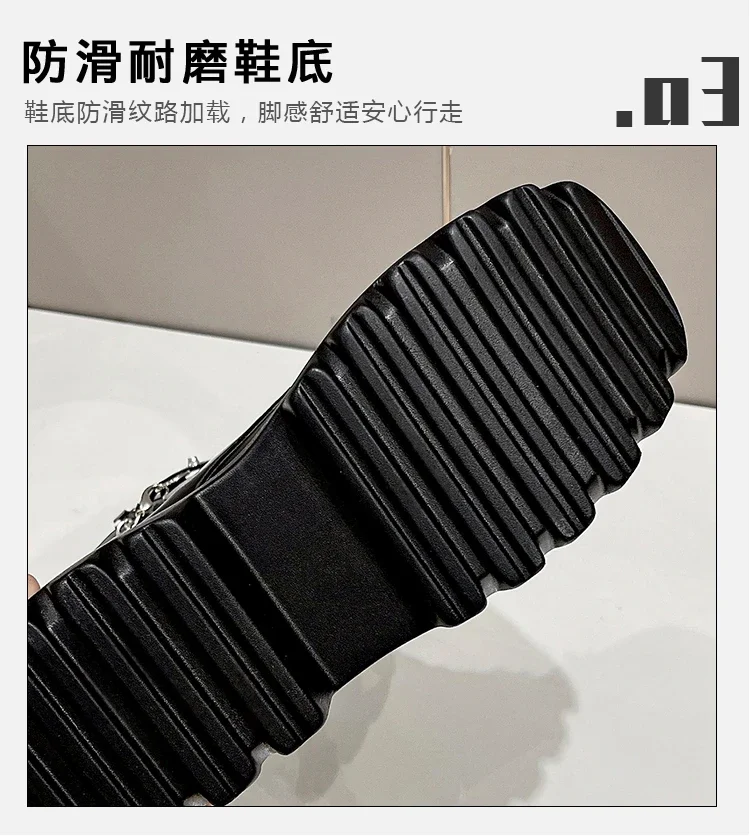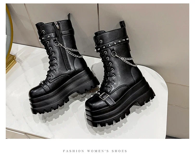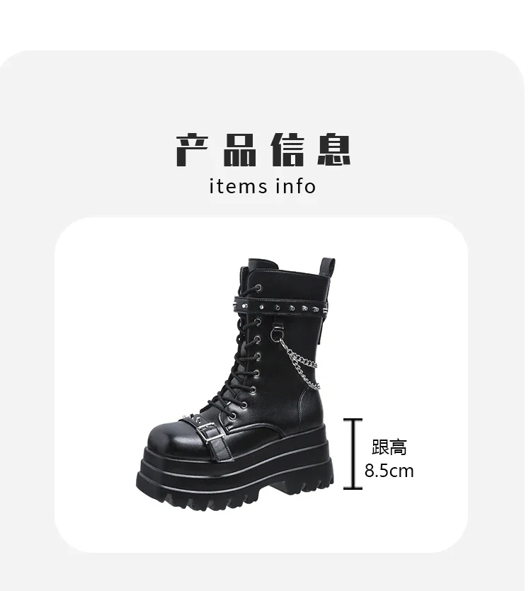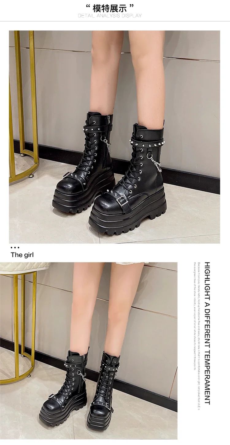 Botas góticas gruesas con plataforma para mujer, zapatos de otoño con hebilla, cuñas hasta la rodilla, Botas Punk Street Cosplay, cadena de motocicleta
