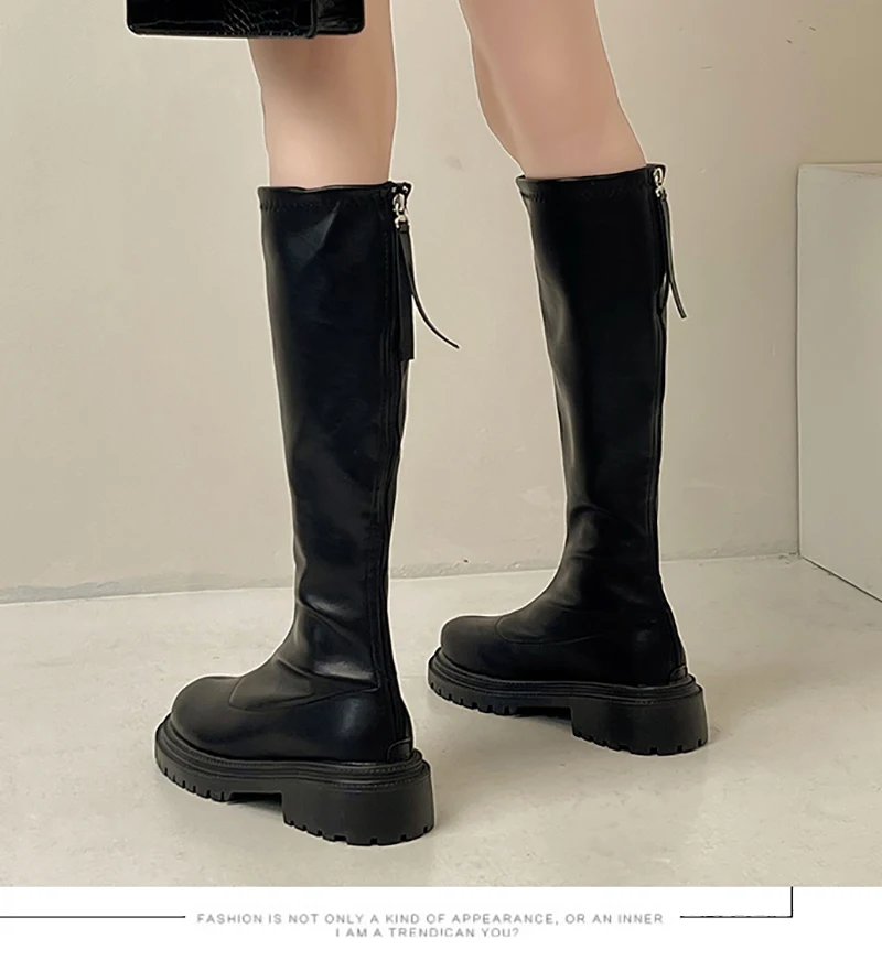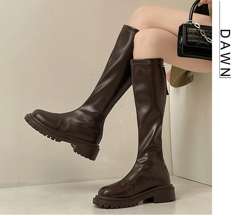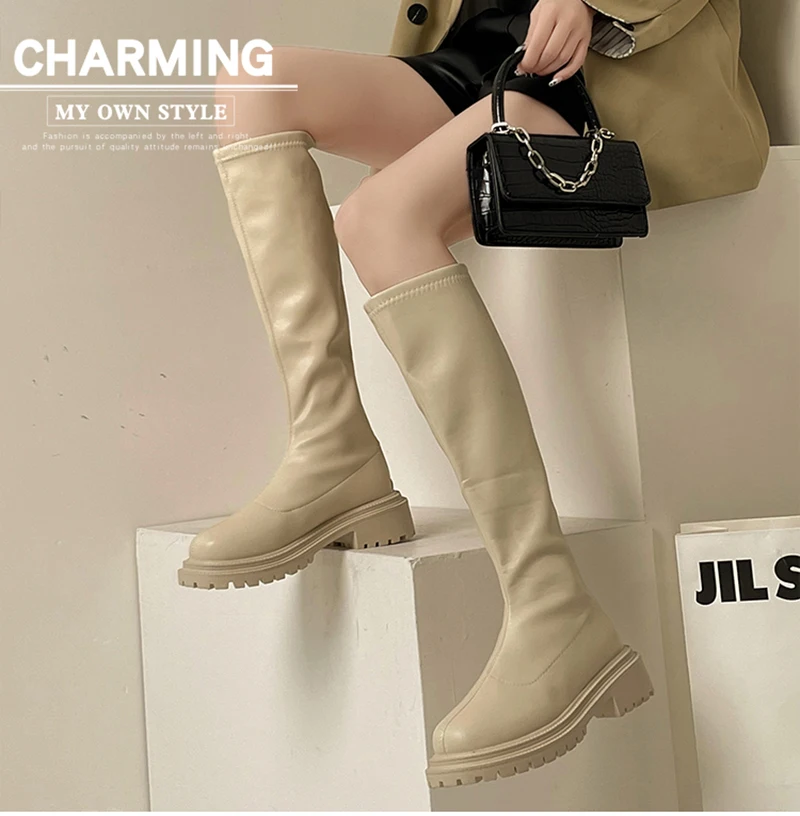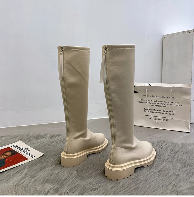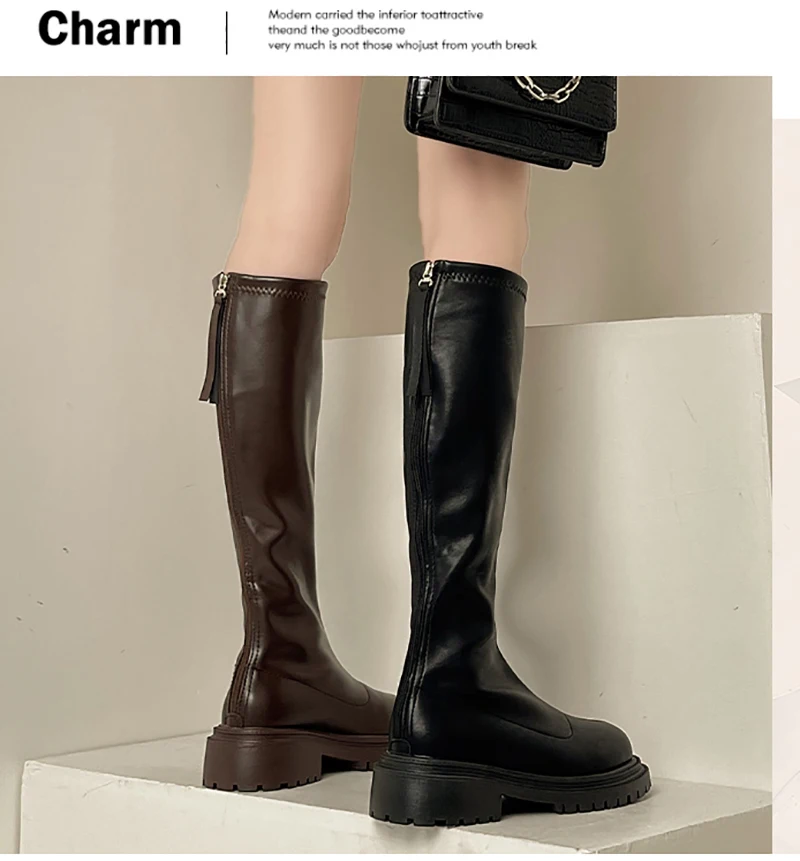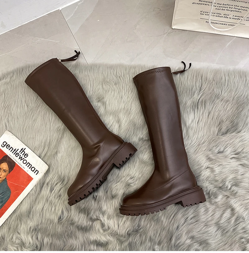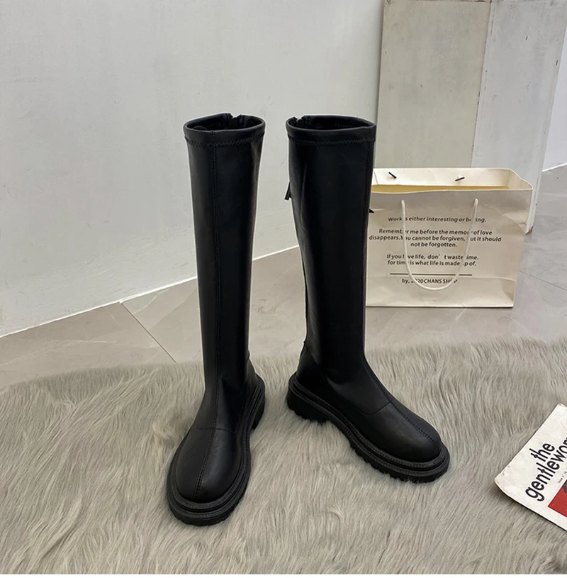 Botas hasta el muslo de cuero suave para mujer, zapatos hasta la rodilla, tacón cuadrado, otoño e invierno, 2023
