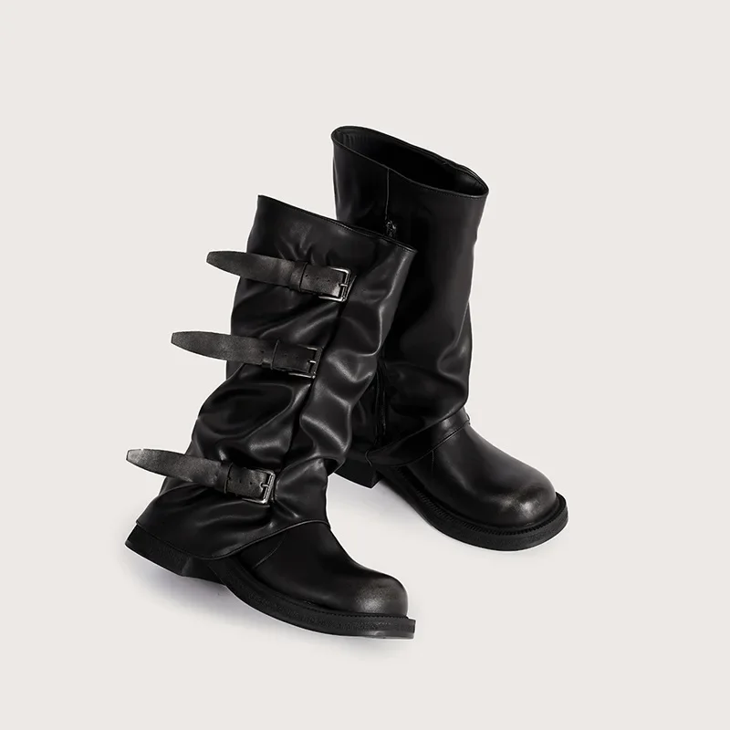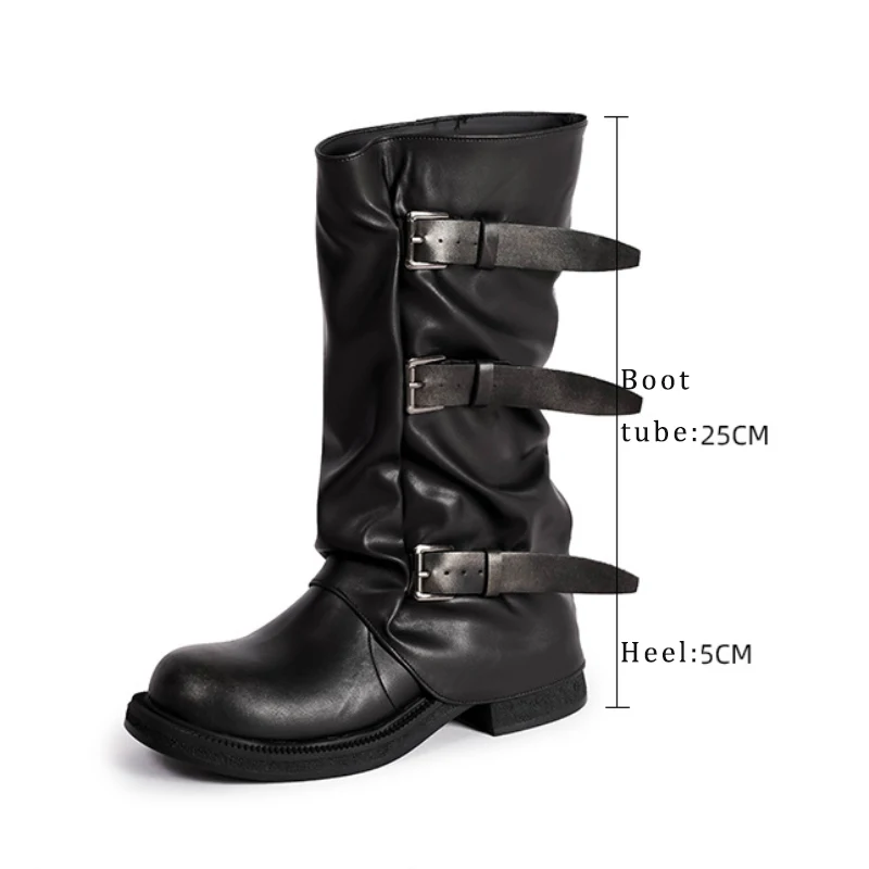 Botas medias de plataforma gruesa Retro con punta redonda para mujer, botas de caballero con hebilla Punk de diseñador de marca, Otoño Invierno, chicas de calle alta