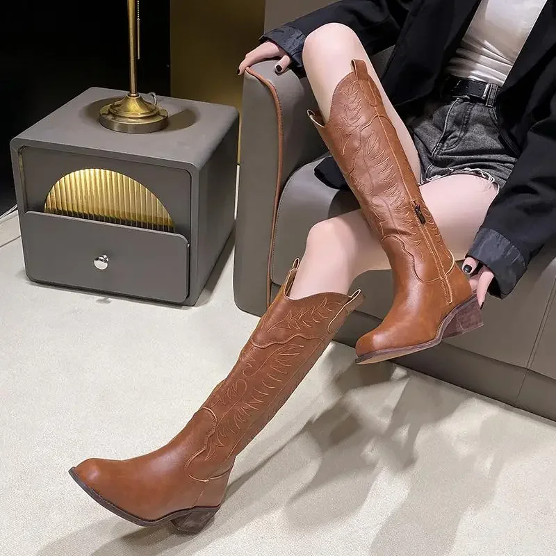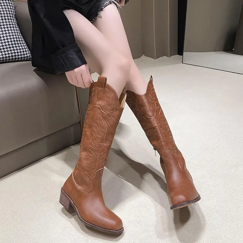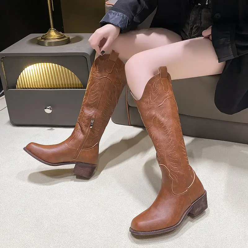 Botas de montar de Pu con cremallera lateral y estampado de tótem Vintage para mujer, botas occidentales de tacón medio a la moda, zapatos sexis hasta la rodilla para invierno 2025