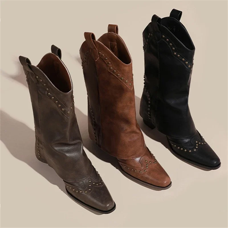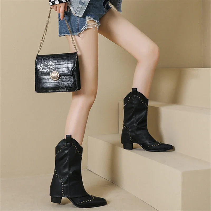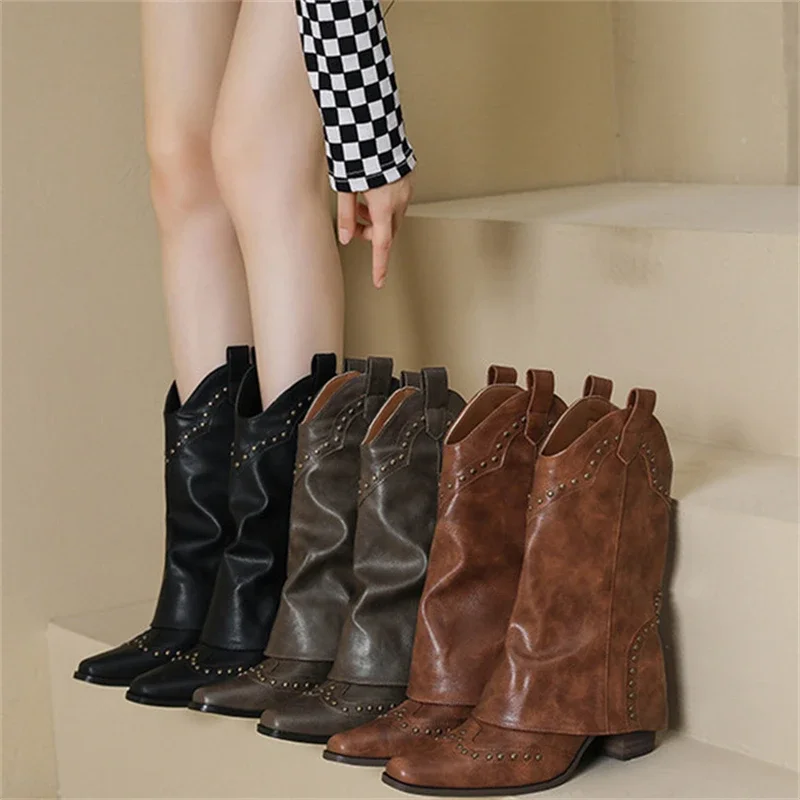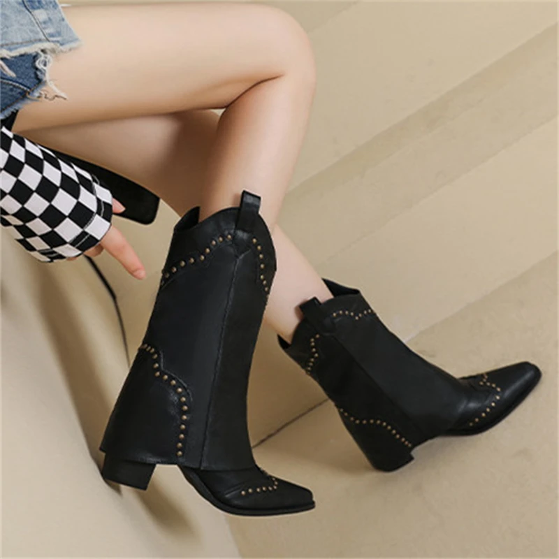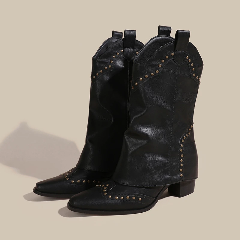 Botas de moto con decoración de remaches y punta estrecha para mujer, botas de caballero con tacón crudo, plataforma informal Retro de Color sólido
