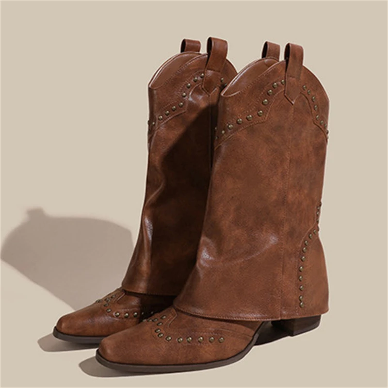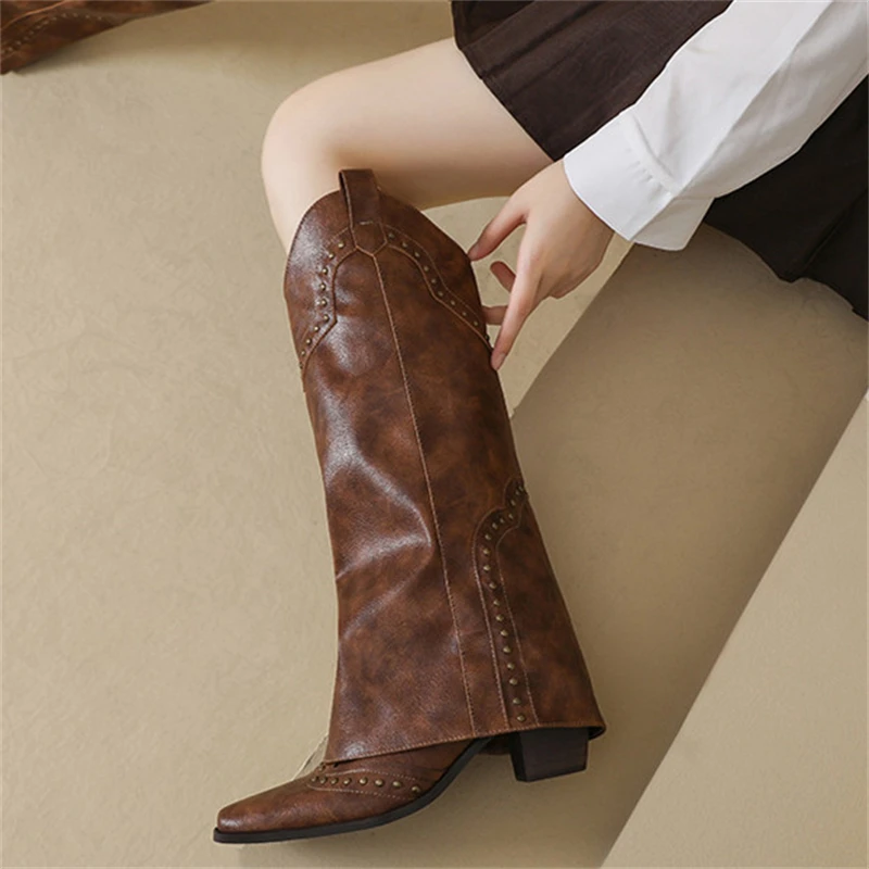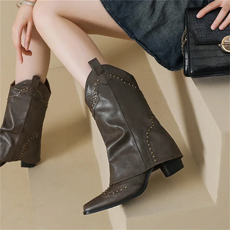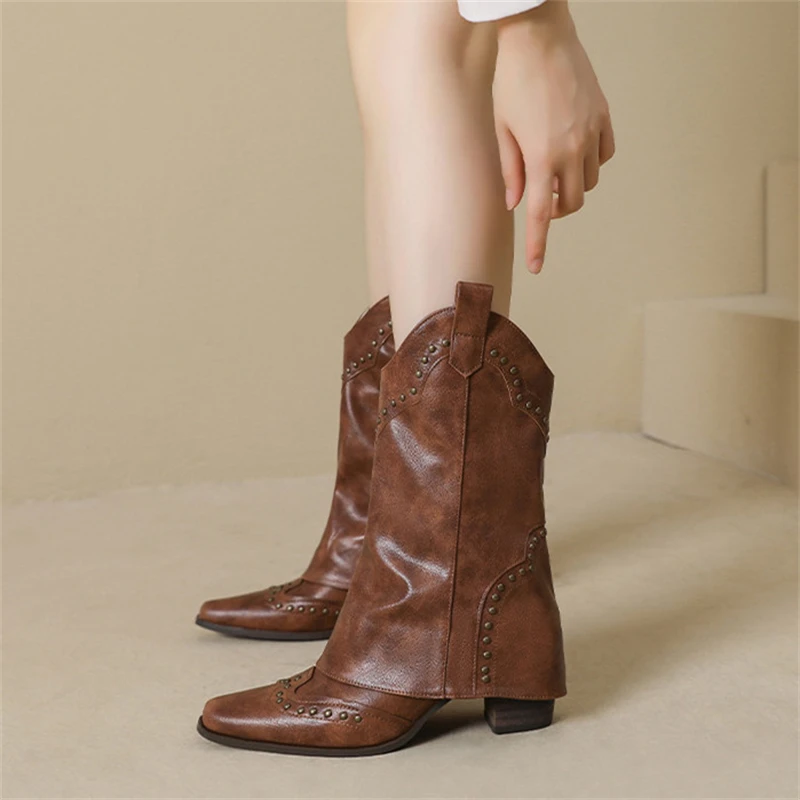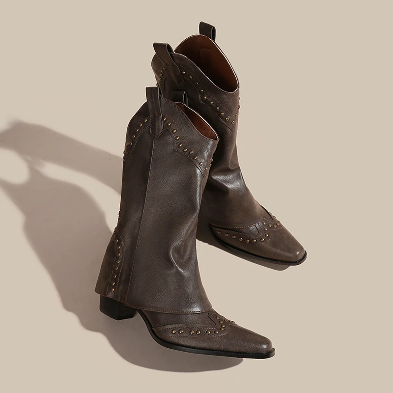 Botas de moto con decoración de remaches y punta estrecha para mujer, botas de caballero con tacón crudo, plataforma informal Retro de Color sólido
