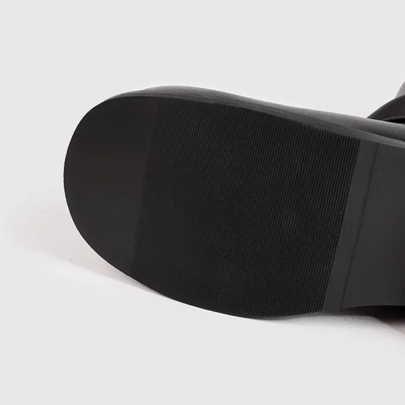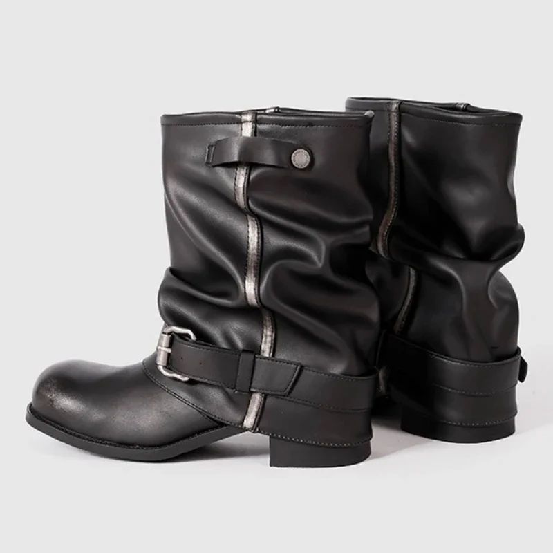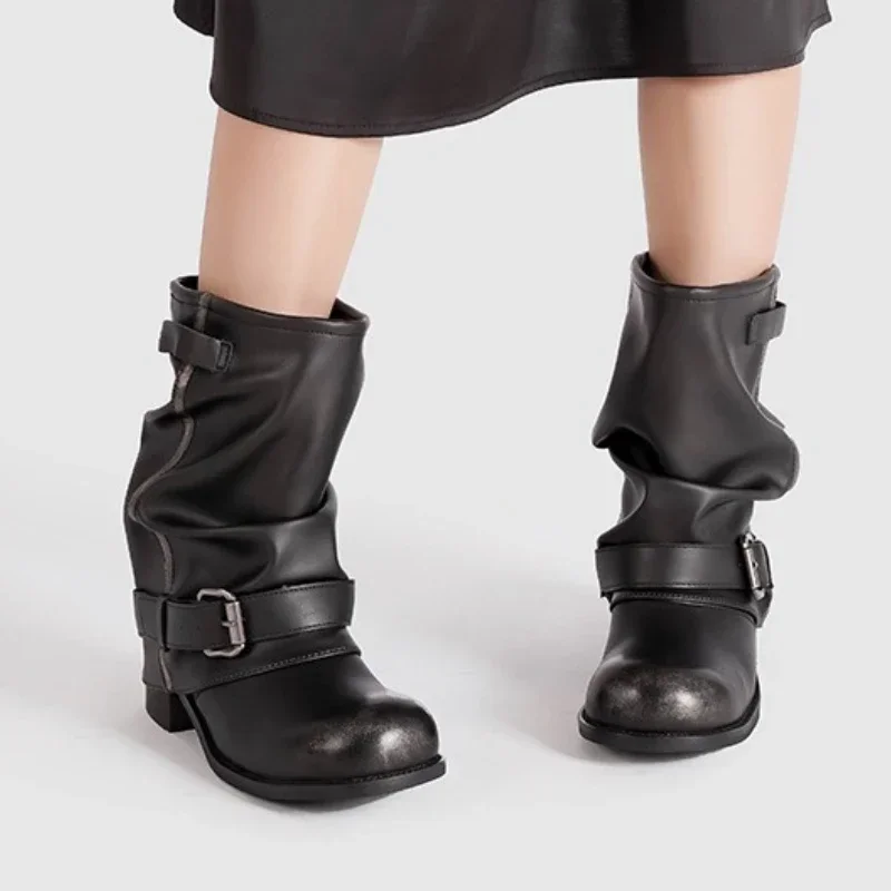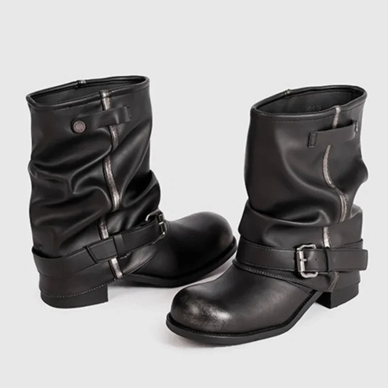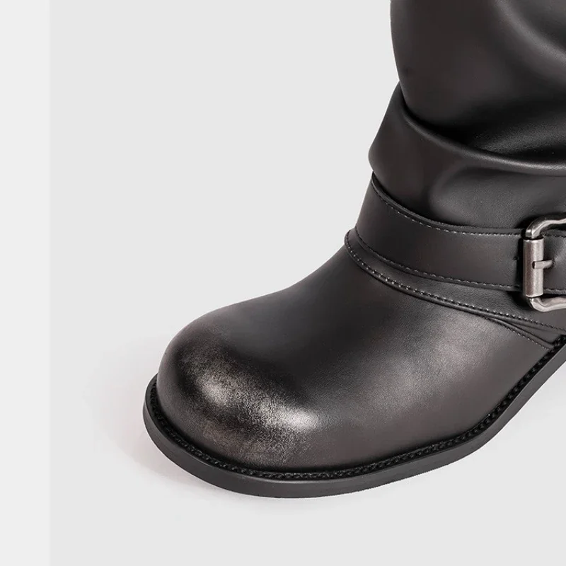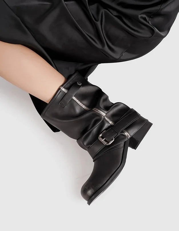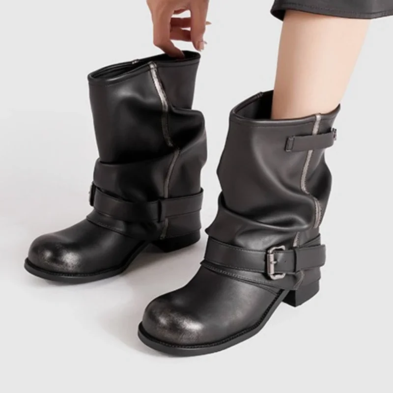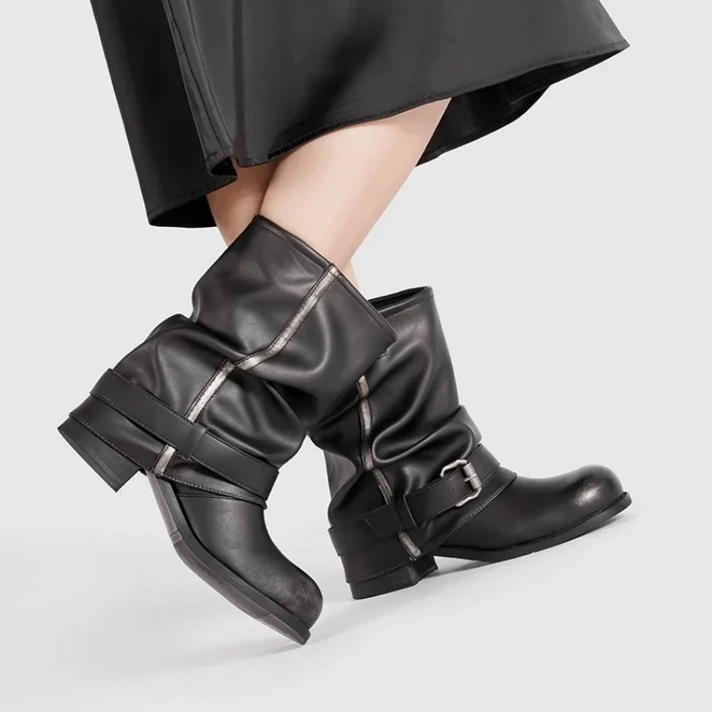 Botas de mujer con diseño de hebilla de cinturón a la moda, botas de motociclista con plataforma de raíz gruesa, cómodas, antideslizantes, punta redonda, botas de media pantorrilla