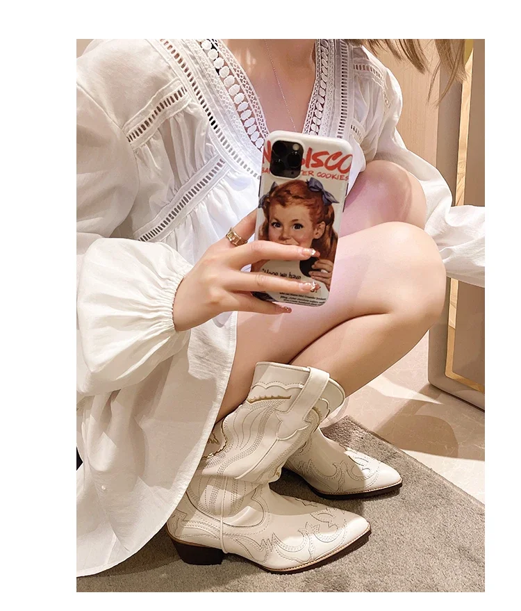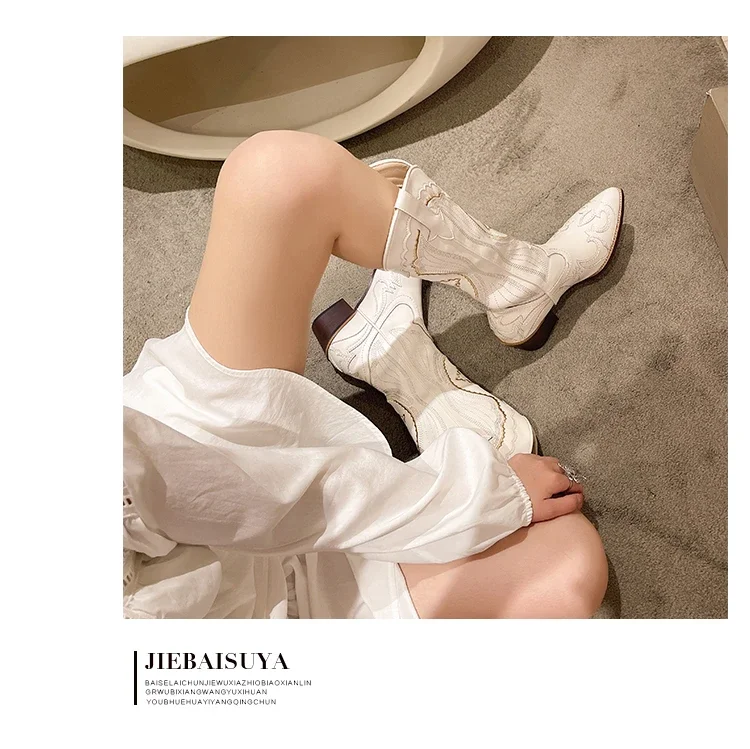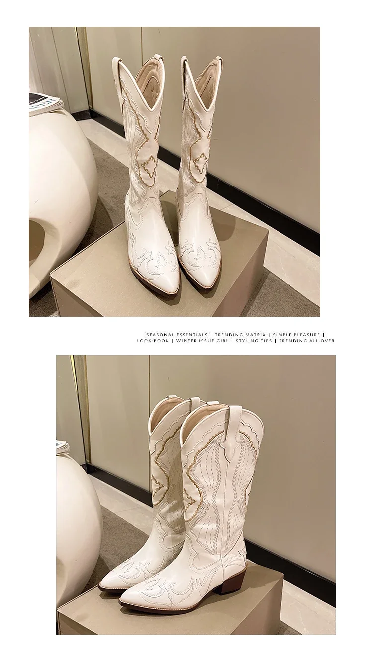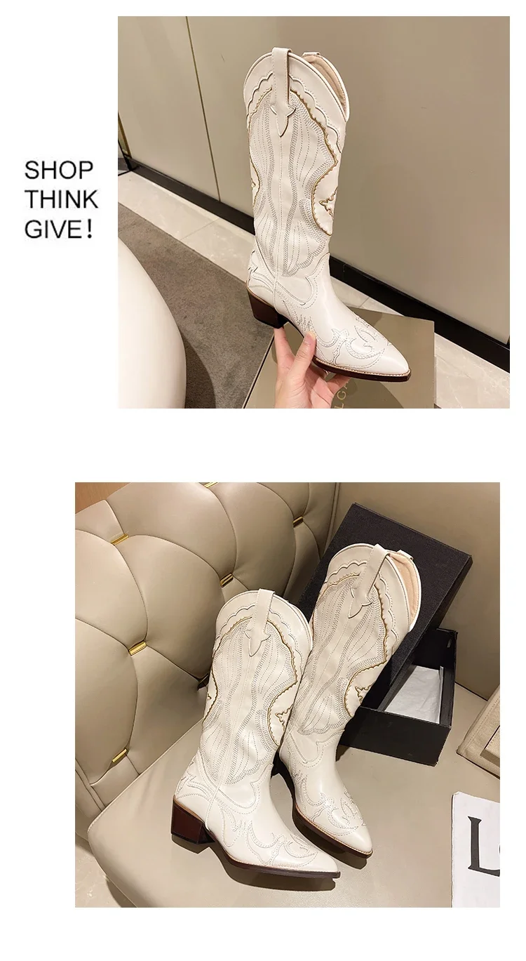 Botas de mujer Retro Otoño Invierno botas blancas hasta la rodilla talla grande 41 mujeres cómodas para caminar botas de vaquero del oeste zapatos de mujer