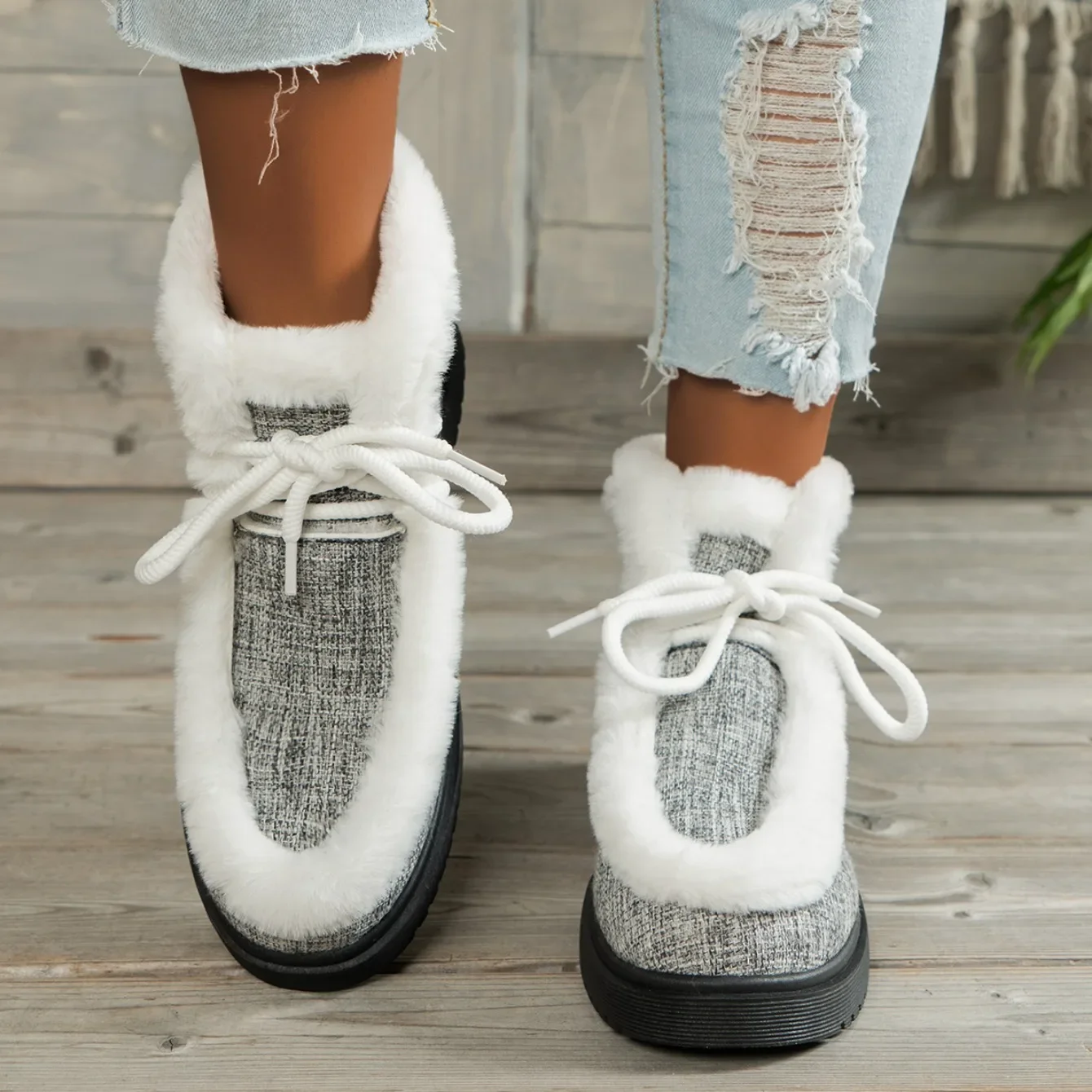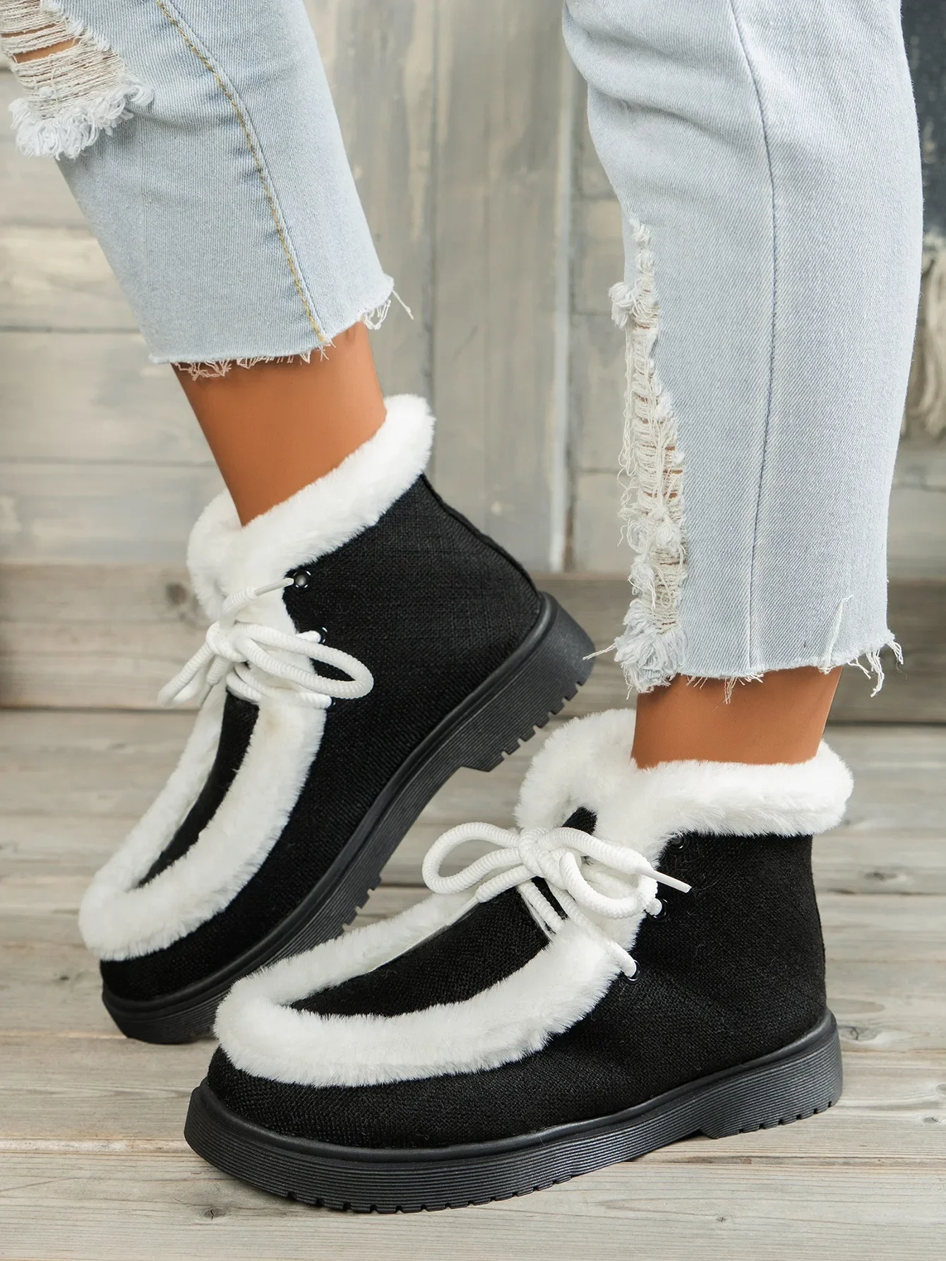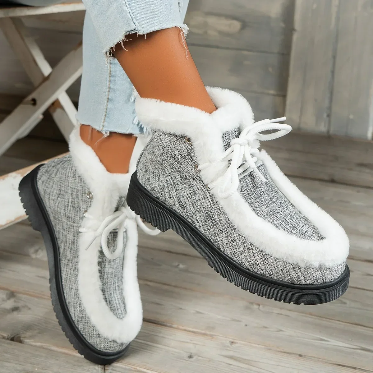 Botas de nieve con cordones y punta redonda para mujer, botines cortos de suela gruesa, Zapatillas altas de lana, zapatos planos cálidos, invierno, 2024