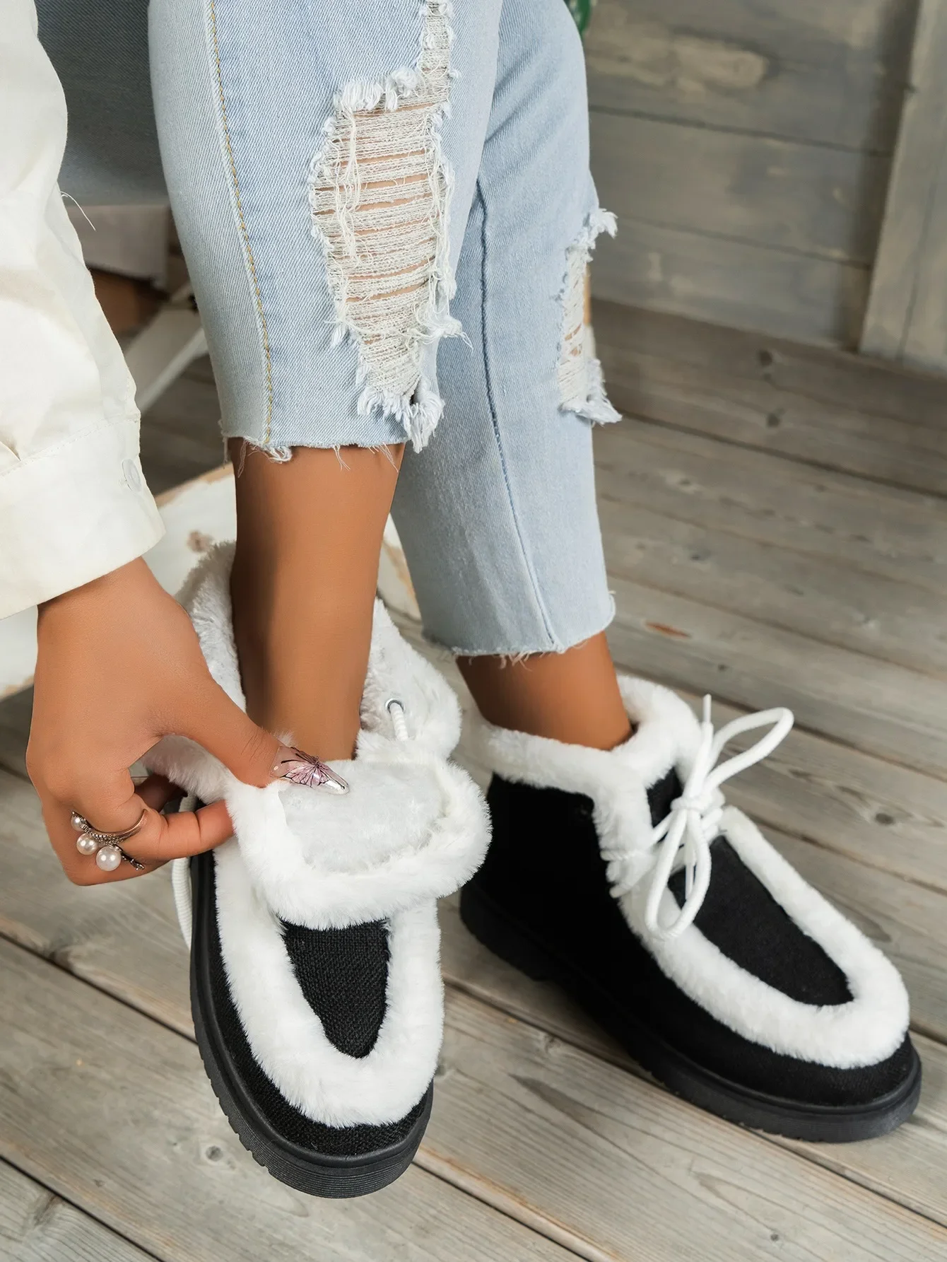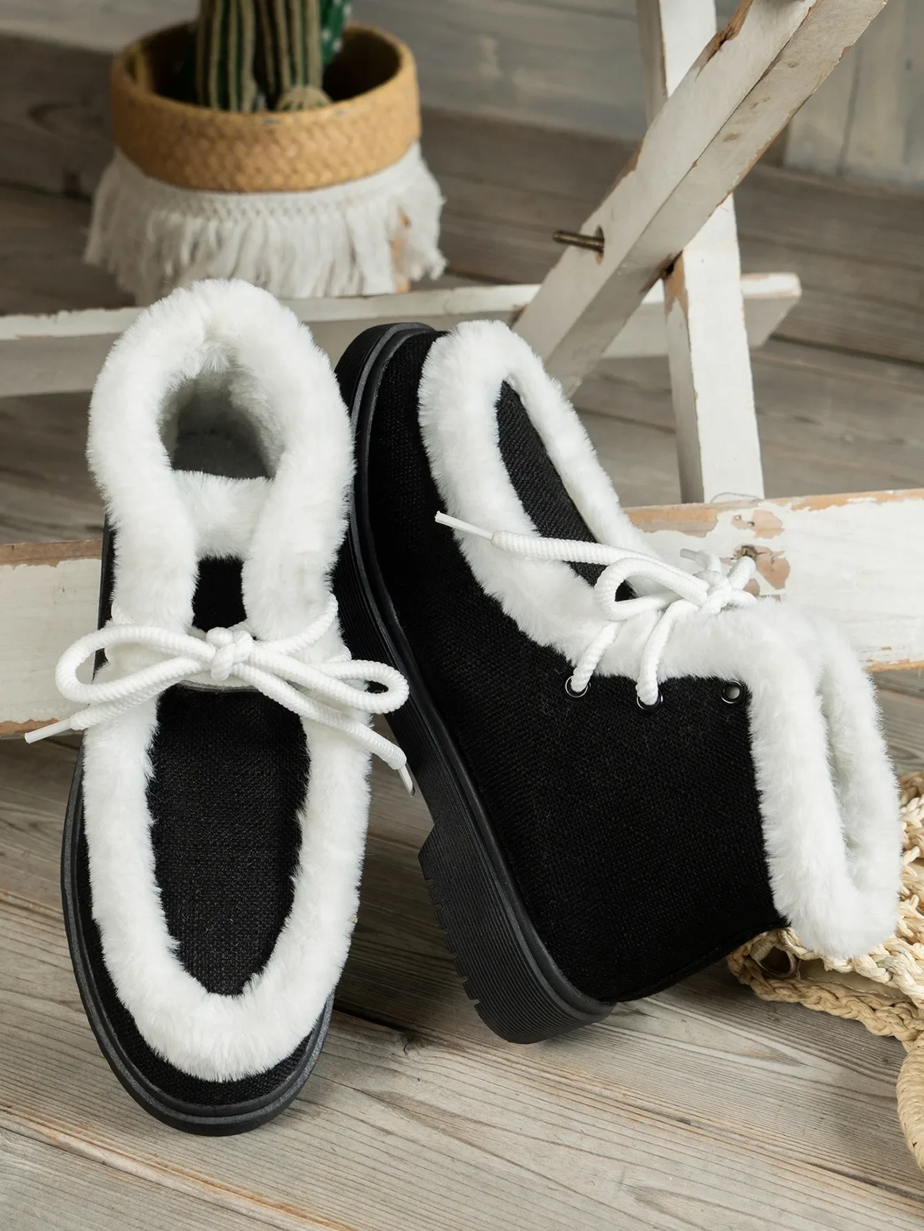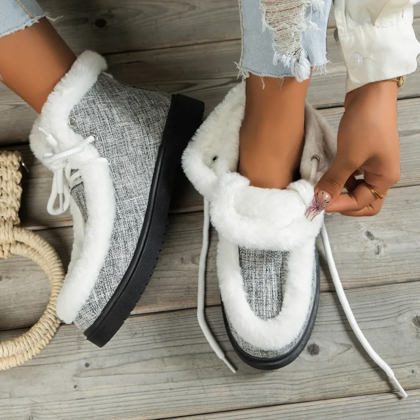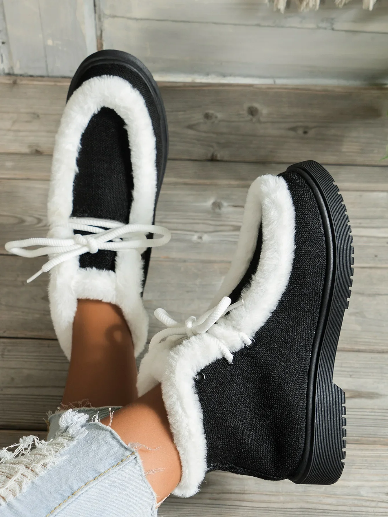 Botas de nieve con cordones y punta redonda para mujer, botines cortos de suela gruesa, Zapatillas altas de lana, zapatos planos cálidos, invierno, 2024