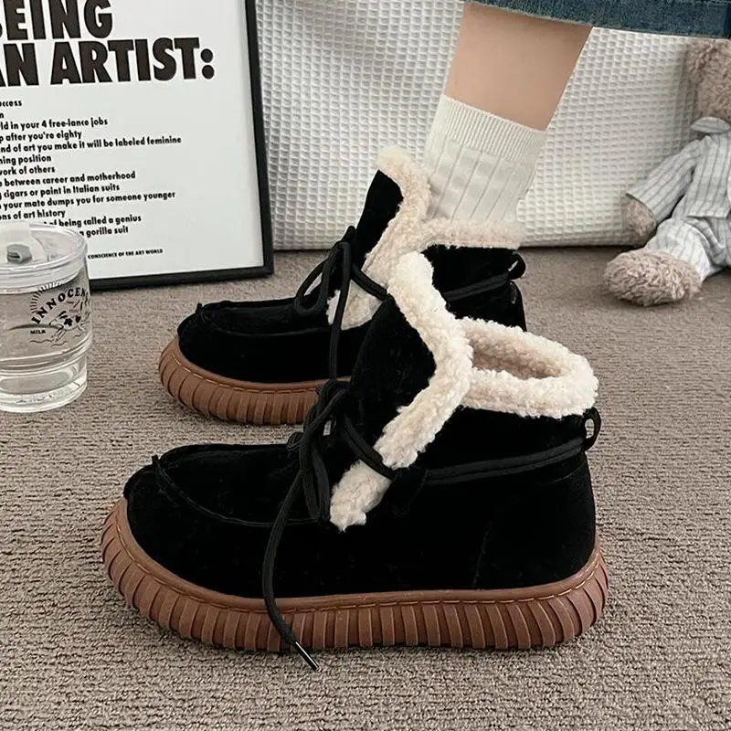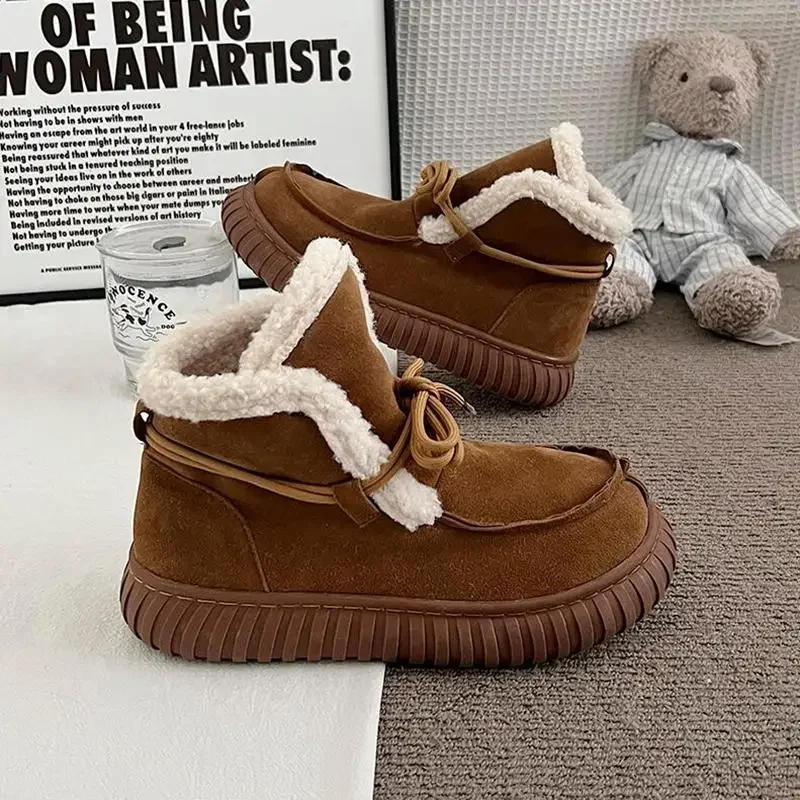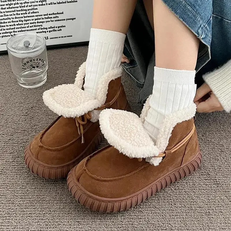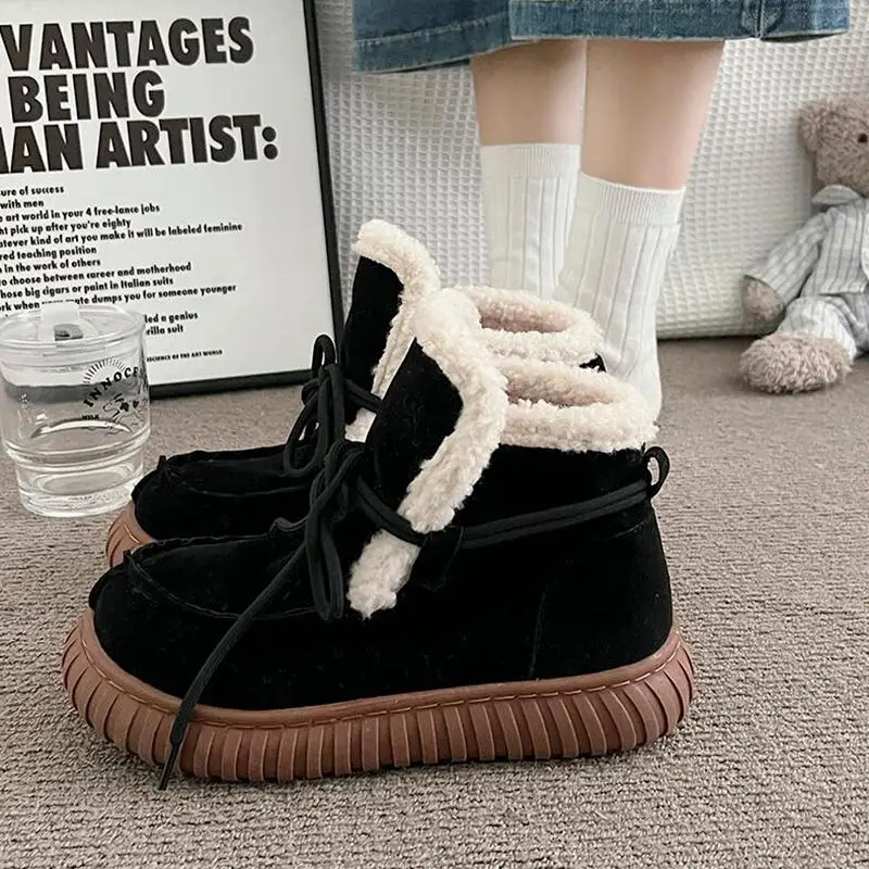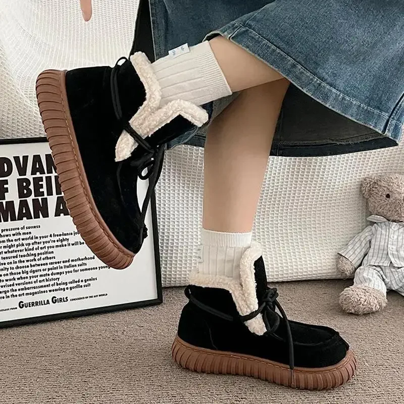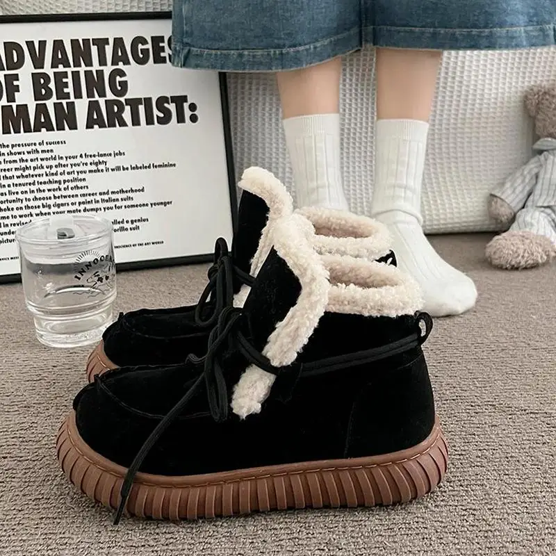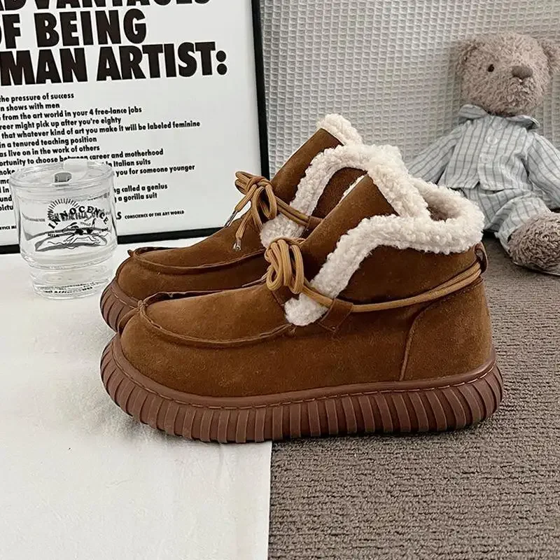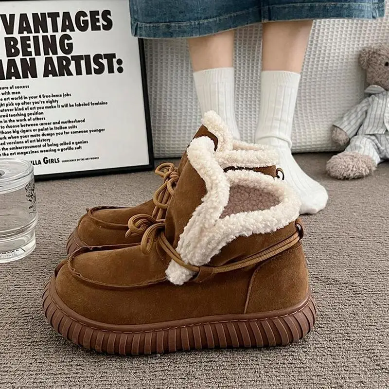 Botas de nieve de gamuza peluda con parte inferior gruesa para mujer, botines de piel esponjosa con cordones y plataforma gruesa, zapatos cálidos de felpa para mujer