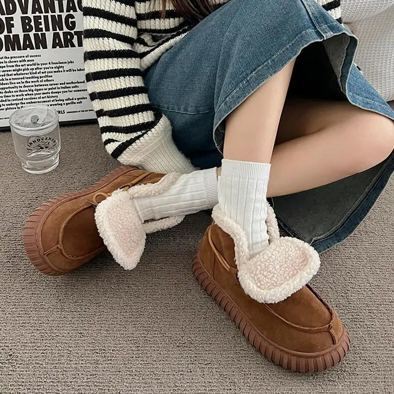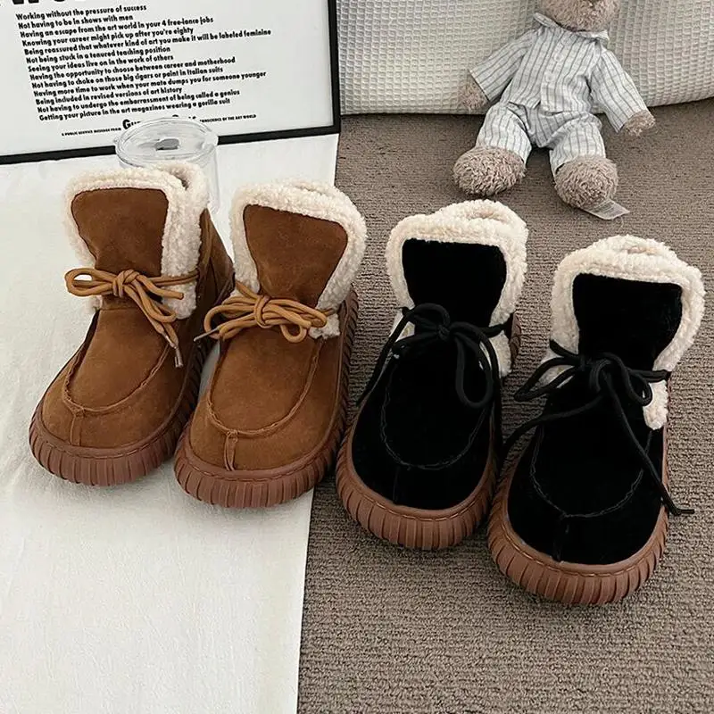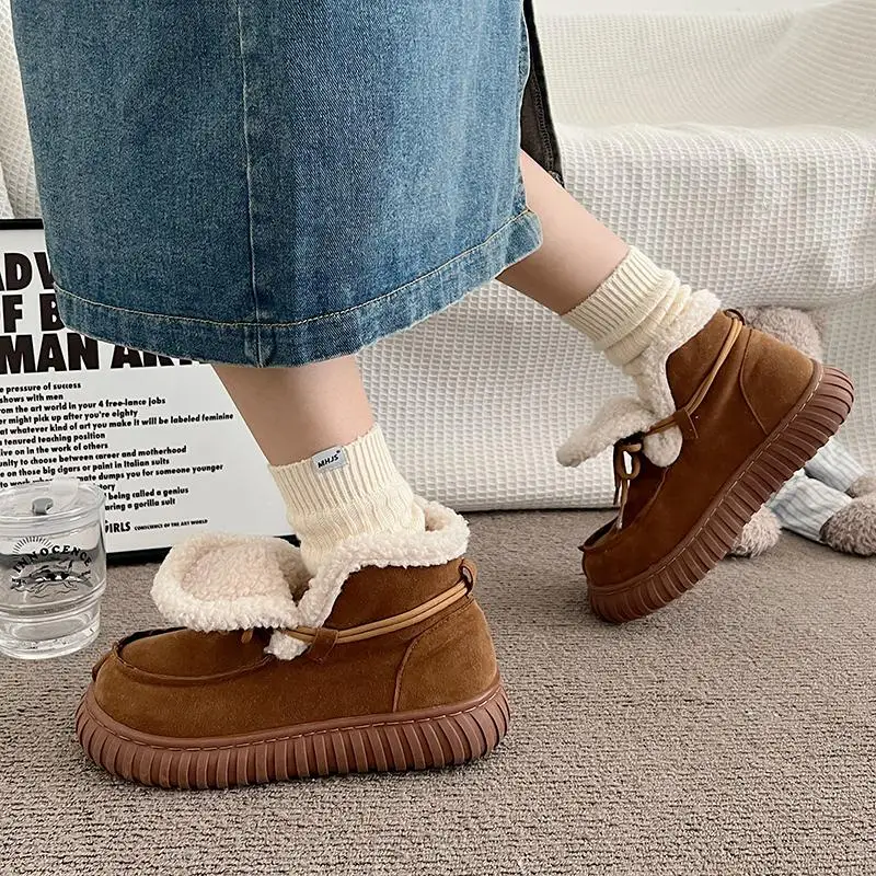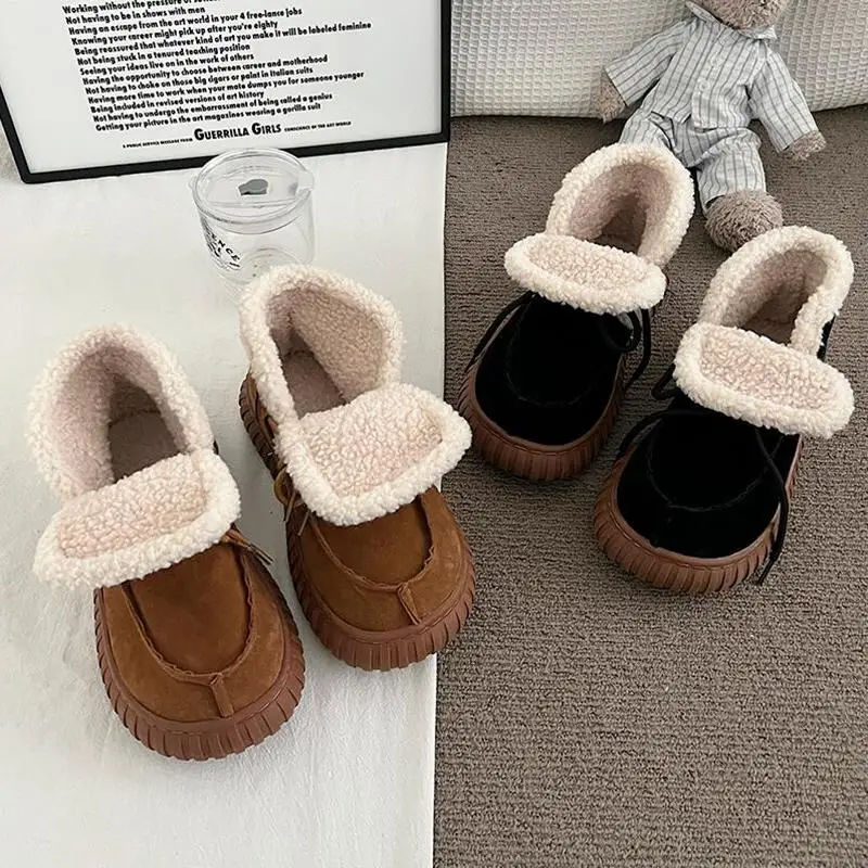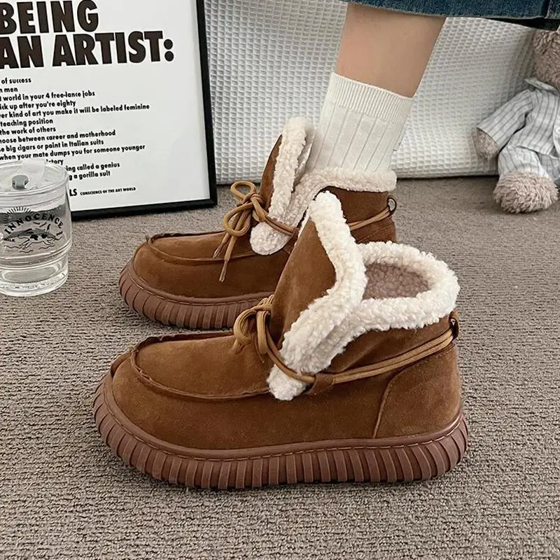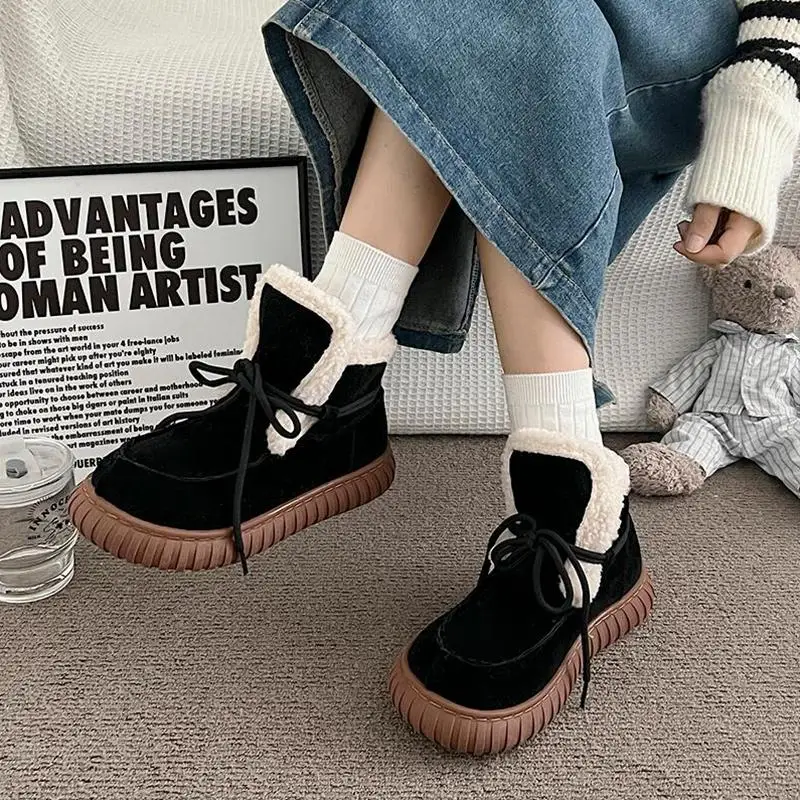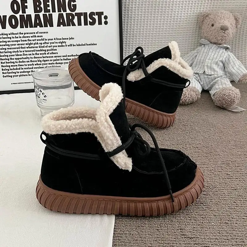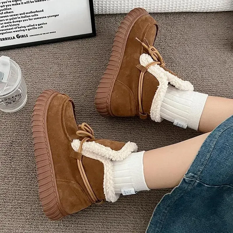 Botas de nieve de gamuza peluda con parte inferior gruesa para mujer, botines de piel esponjosa con cordones y plataforma gruesa, zapatos cálidos de felpa para mujer