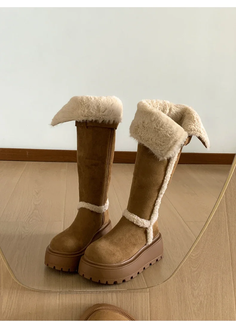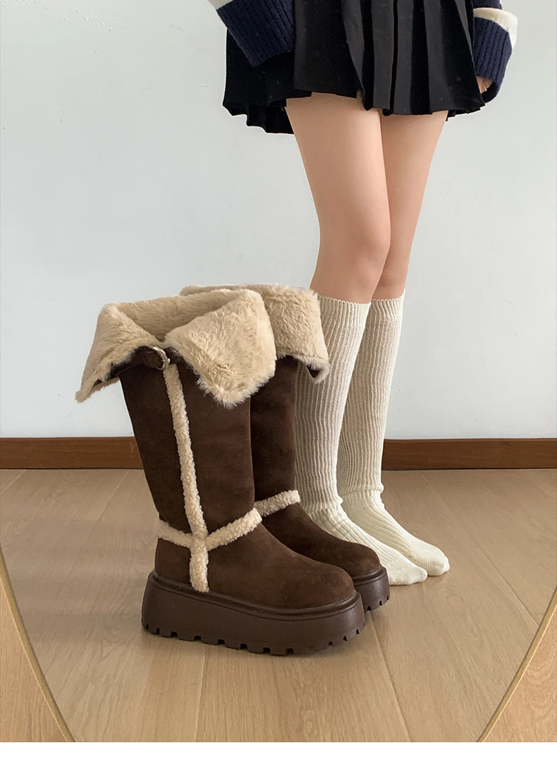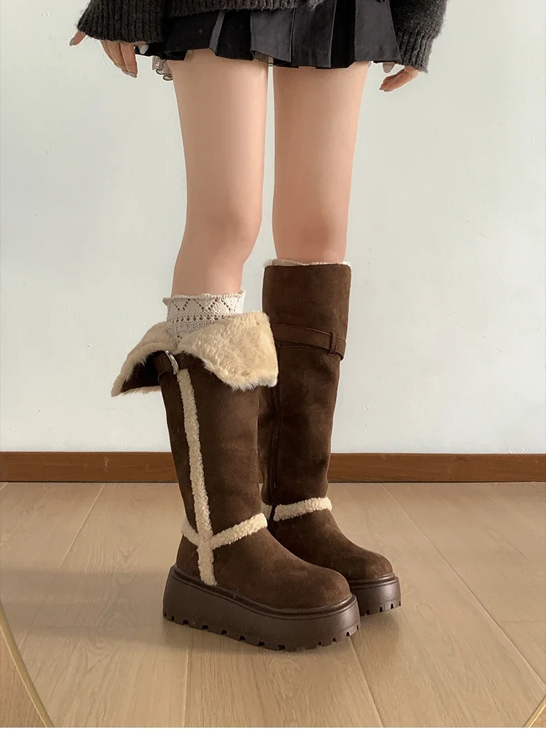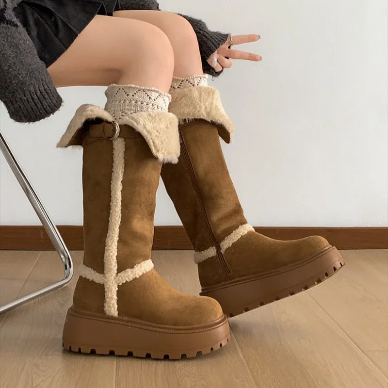 Botas De nieve De piel De algodón cálidas para Mujer, Zapatos planos con plataforma a la moda, botines largos De caballero Vintage para Mujer