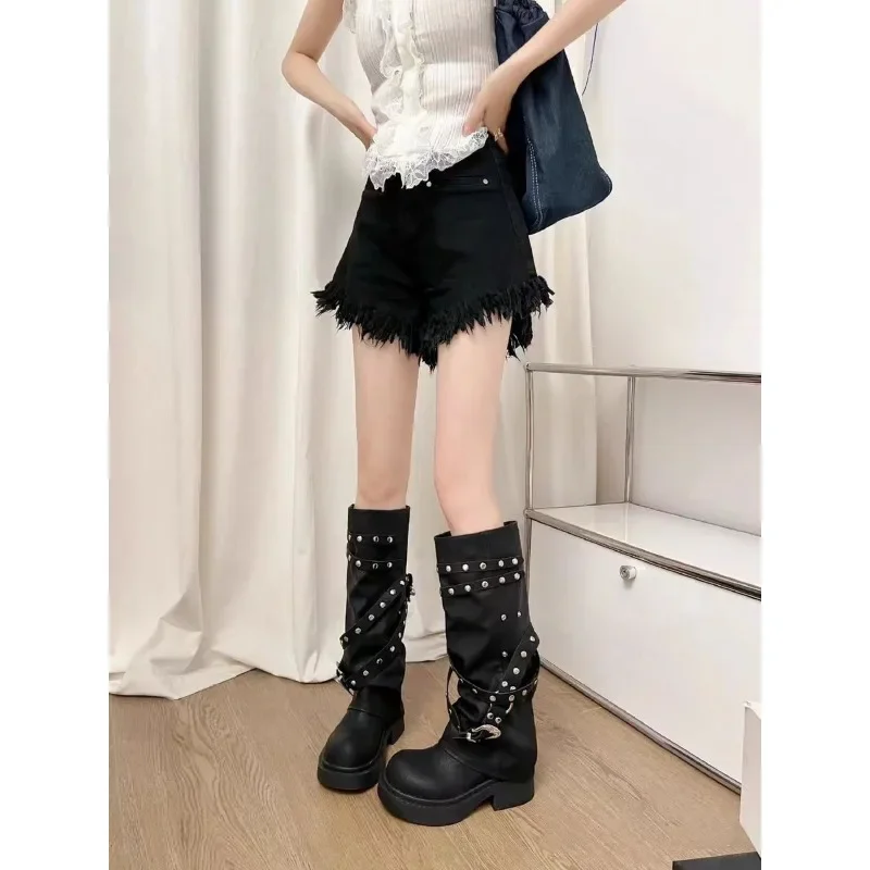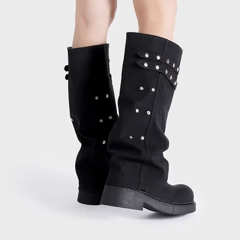 Botas de pierna negra con remaches para mujer, botas largas por encima de la rodilla, estilo Punk de suela gruesa, 2024
