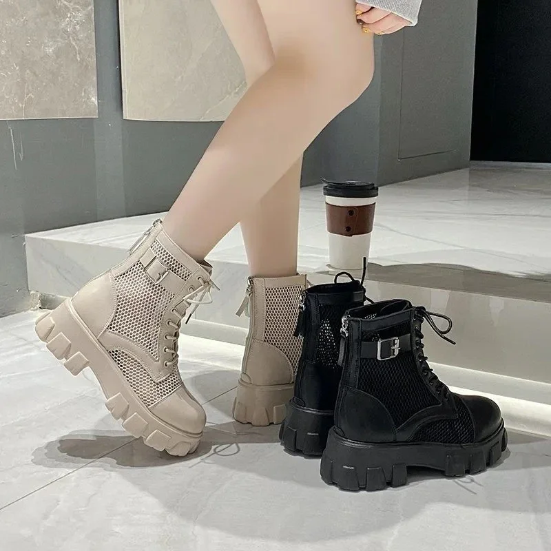 Botas de plataforma respirável para mulheres, tornozelo, sapato baixo, com cordões, malha, tamanho grande 43, verão
