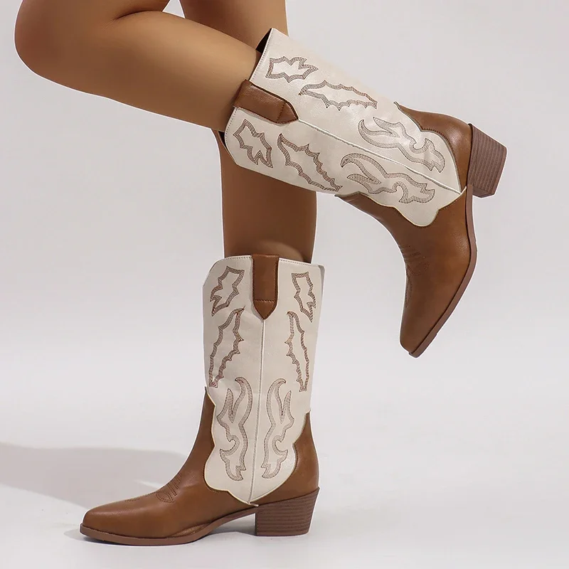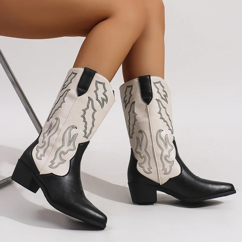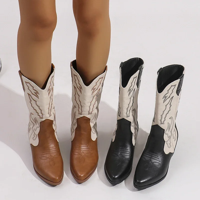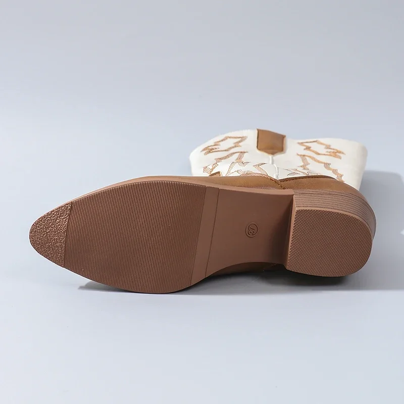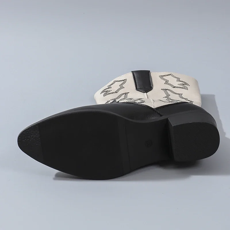 Botas de vaquero del oeste bordadas para mujer, botines largos de caballero de tacón grueso sin cordones a la moda, zapatos femeninos de estilo Retro para Otoño e Invierno
