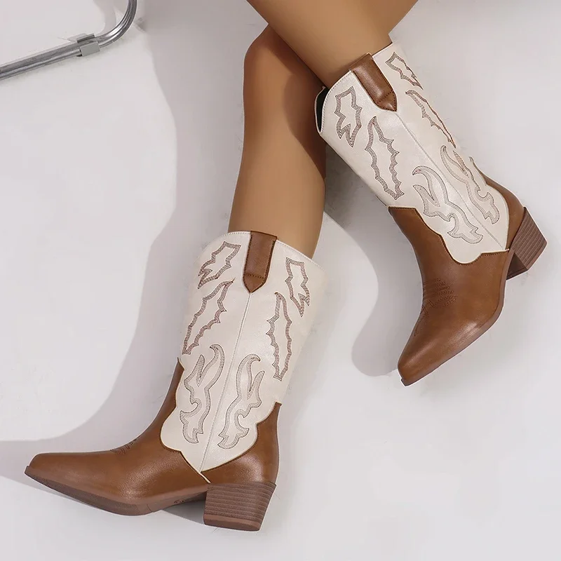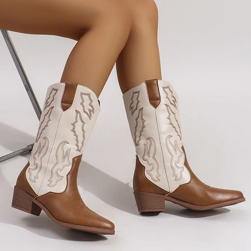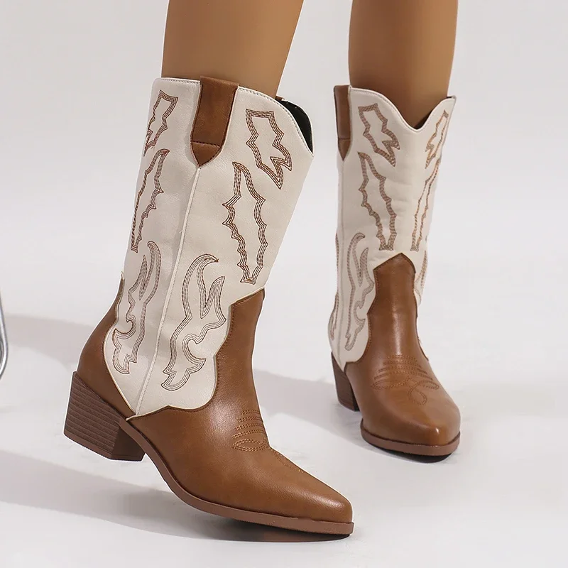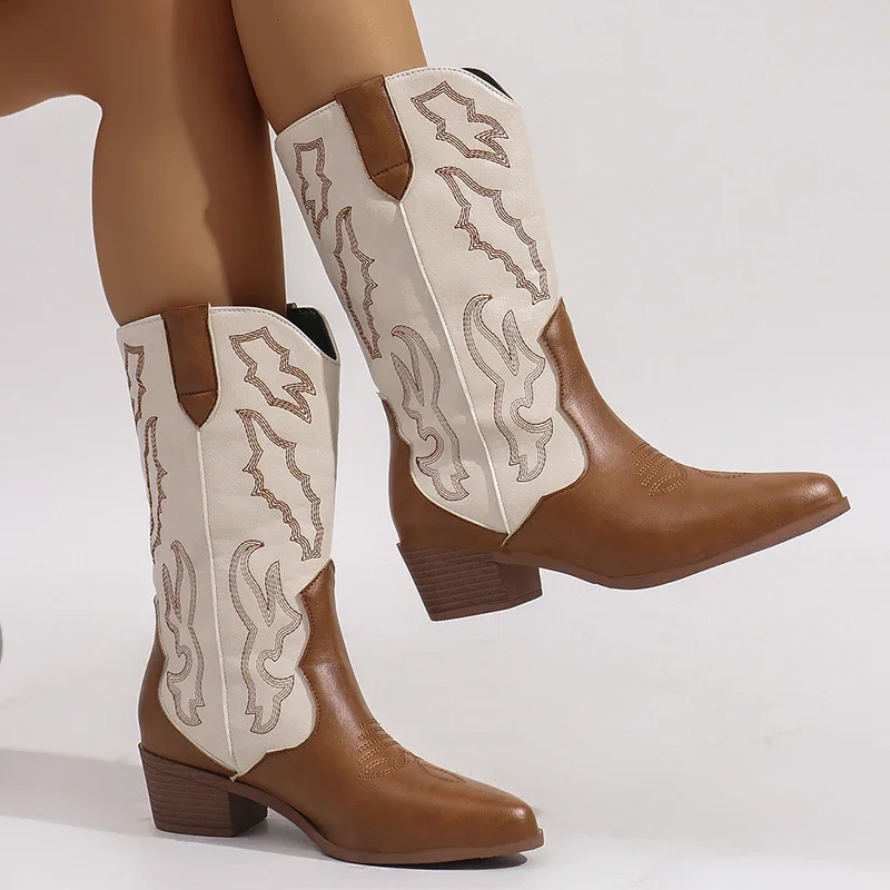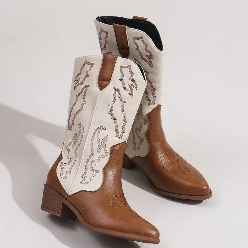 Botas de vaquero del oeste bordadas para mujer, botines largos de caballero de tacón grueso sin cordones a la moda, zapatos femeninos de estilo Retro para Otoño e Invierno