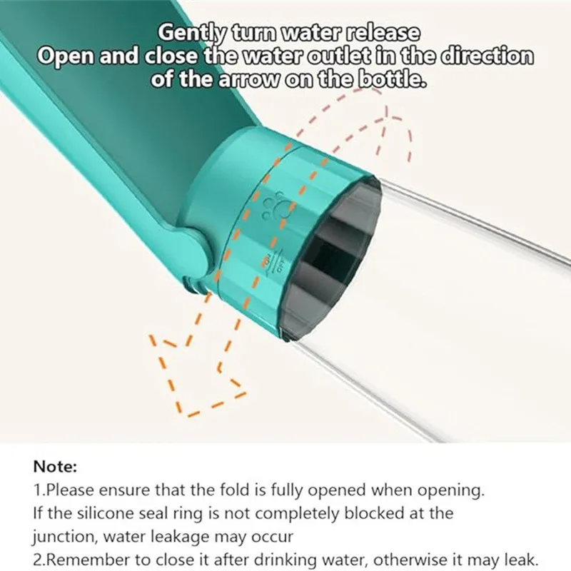 Cómo utilizar: La botella de agua para perros adopta un diseño plegable.Cuando lo utilice, abra la parte plegable y gire el interruptor para liberar agua.Recuerde cerrar el interruptor después de su uso para evitar fugas de agua.